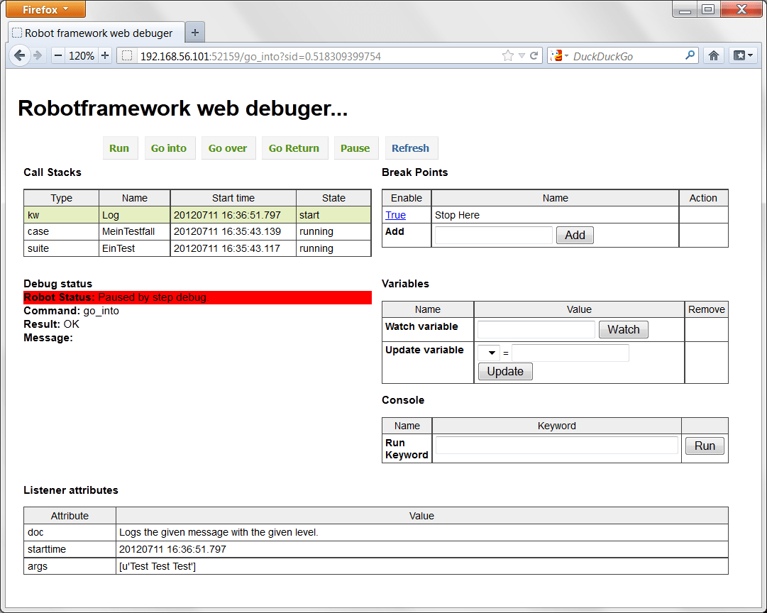 The first impression astounds: Without setting a breakpoint the test just rushes through despite the debugger being in place. Started with a valid breakpoint (“pybot --listener rdb.Listener:Log SimpleTest.txt” sets a breakpoint at the “Log” keyword) the test runs until the breakpoint is reached and stops there. RDB prints the URL for accessing the web GUI to the command line.