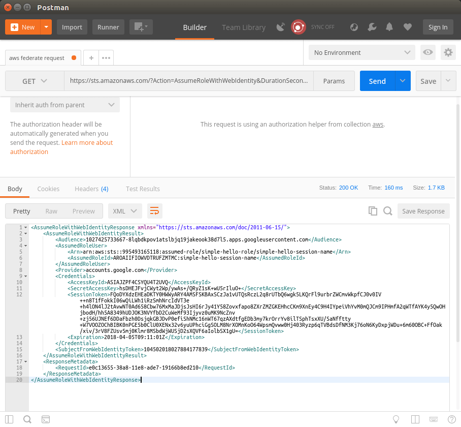 The XML response contains all that you need to authenticate against the webservice. Copy AccessKeyId, SecretAccessKey and SessionToken and insert them into the AWS Signature authorization fields in Postman. Do not forget to provide the corresponding AWS region.