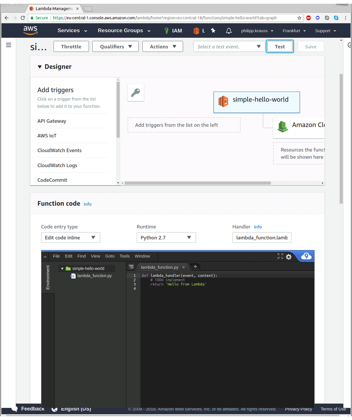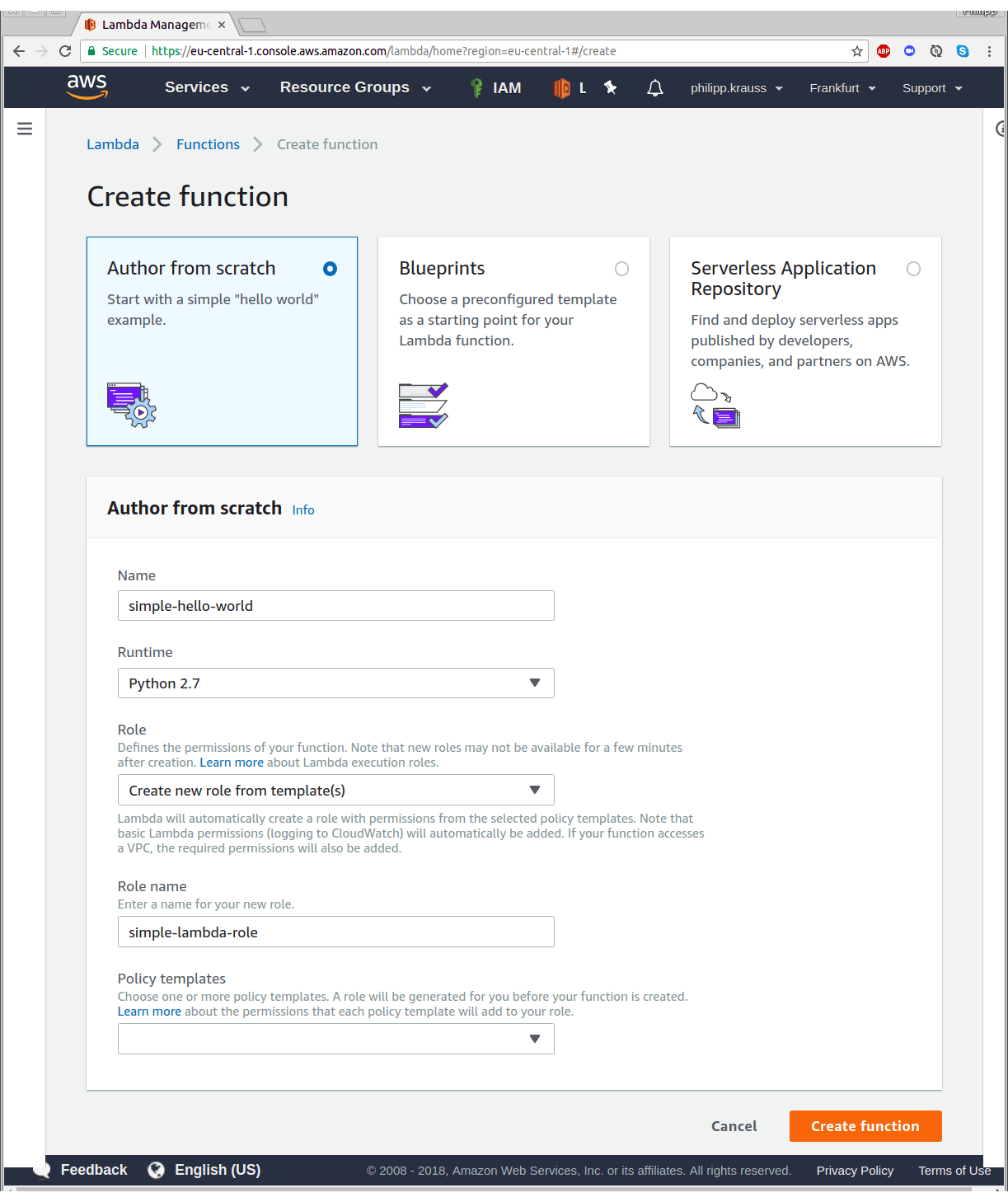 You can now configure your Lambda. Let’s call it “simple-hello-world” and use “Python 2.7” as runtime. You also have to define the permissions for the Lambda. To do this, select “Create new role from template(s)”. As role name, enter “simple-lambda-role”. Hit “Create function” when you’re ready to proceed.