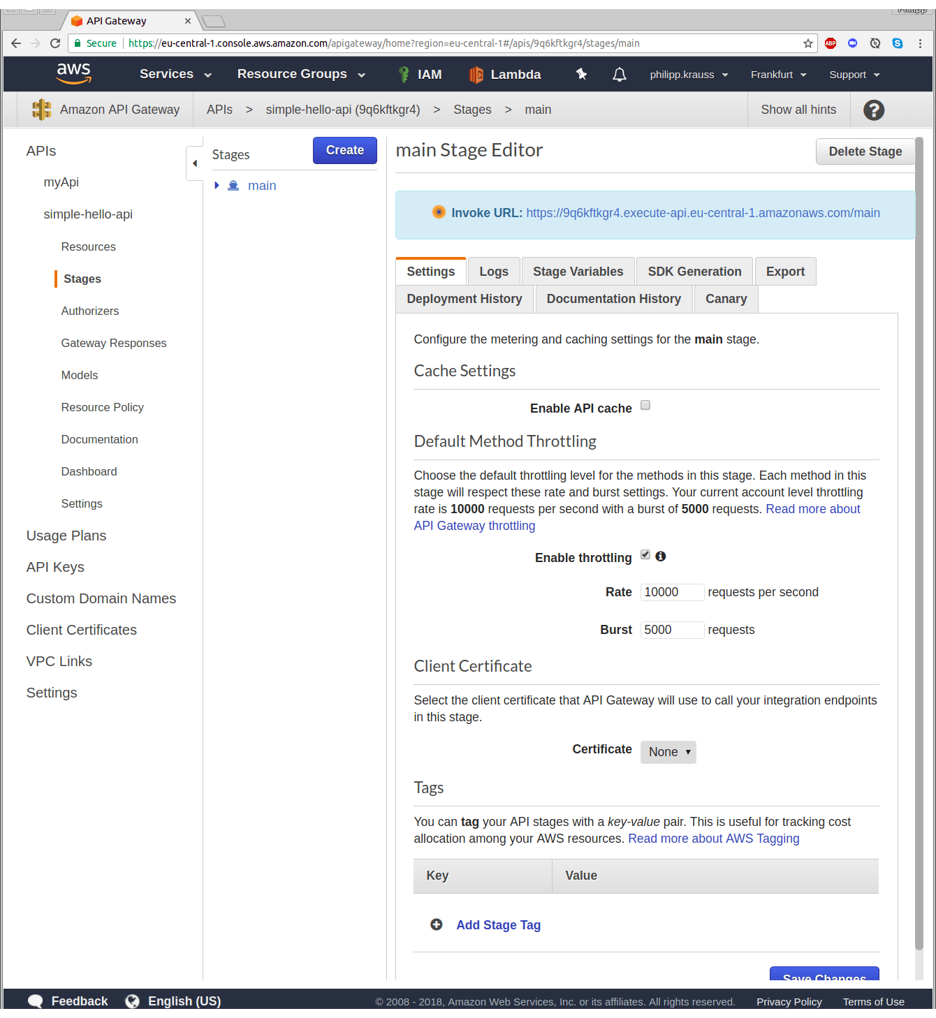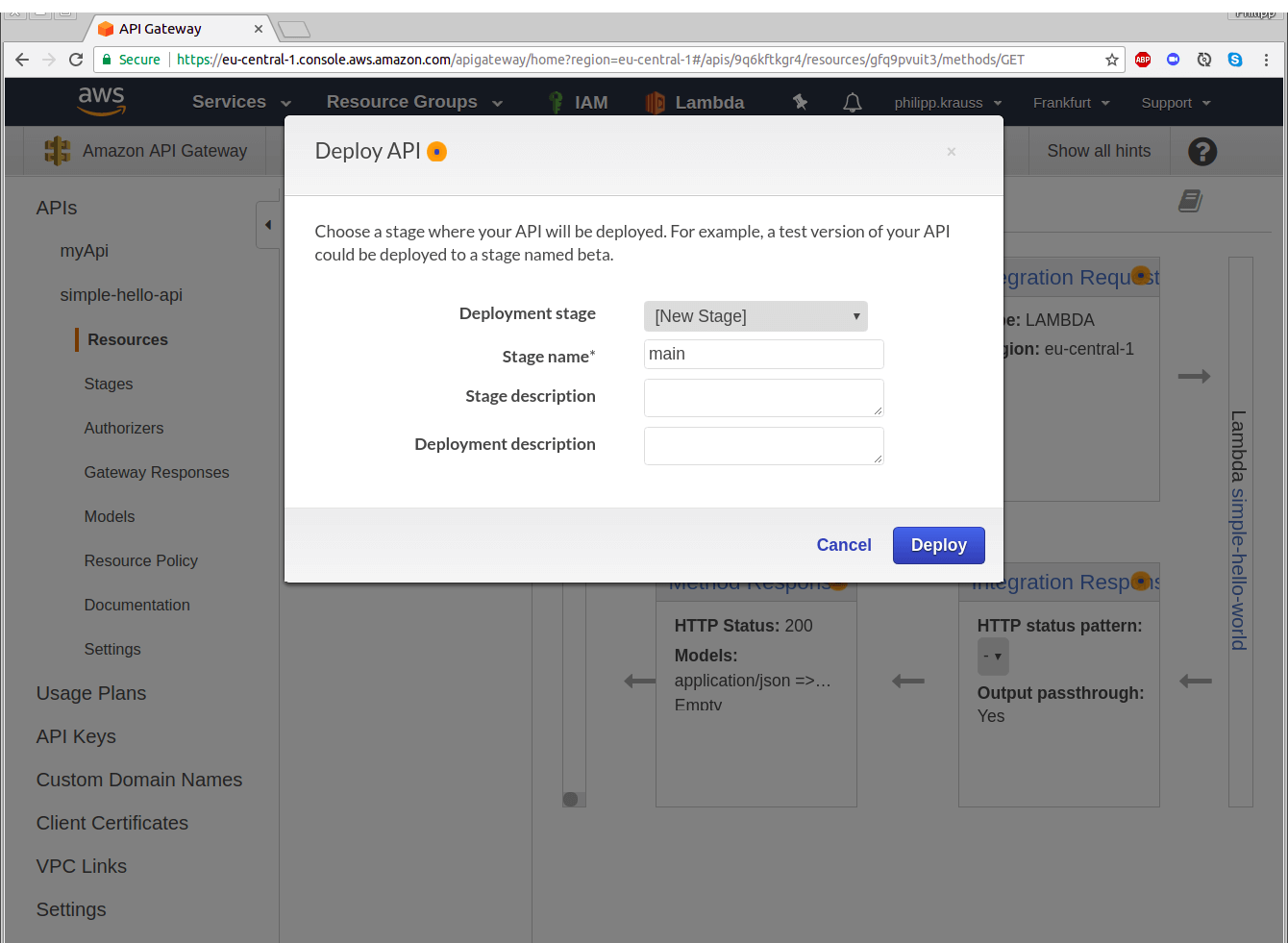 In order to deploy the API, you need to choose a stage. Just select “[New Stage]” and enter “main” as Stage name. Hit “Deploy”.