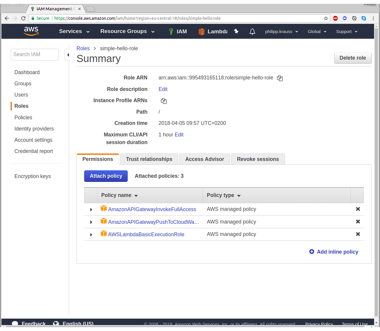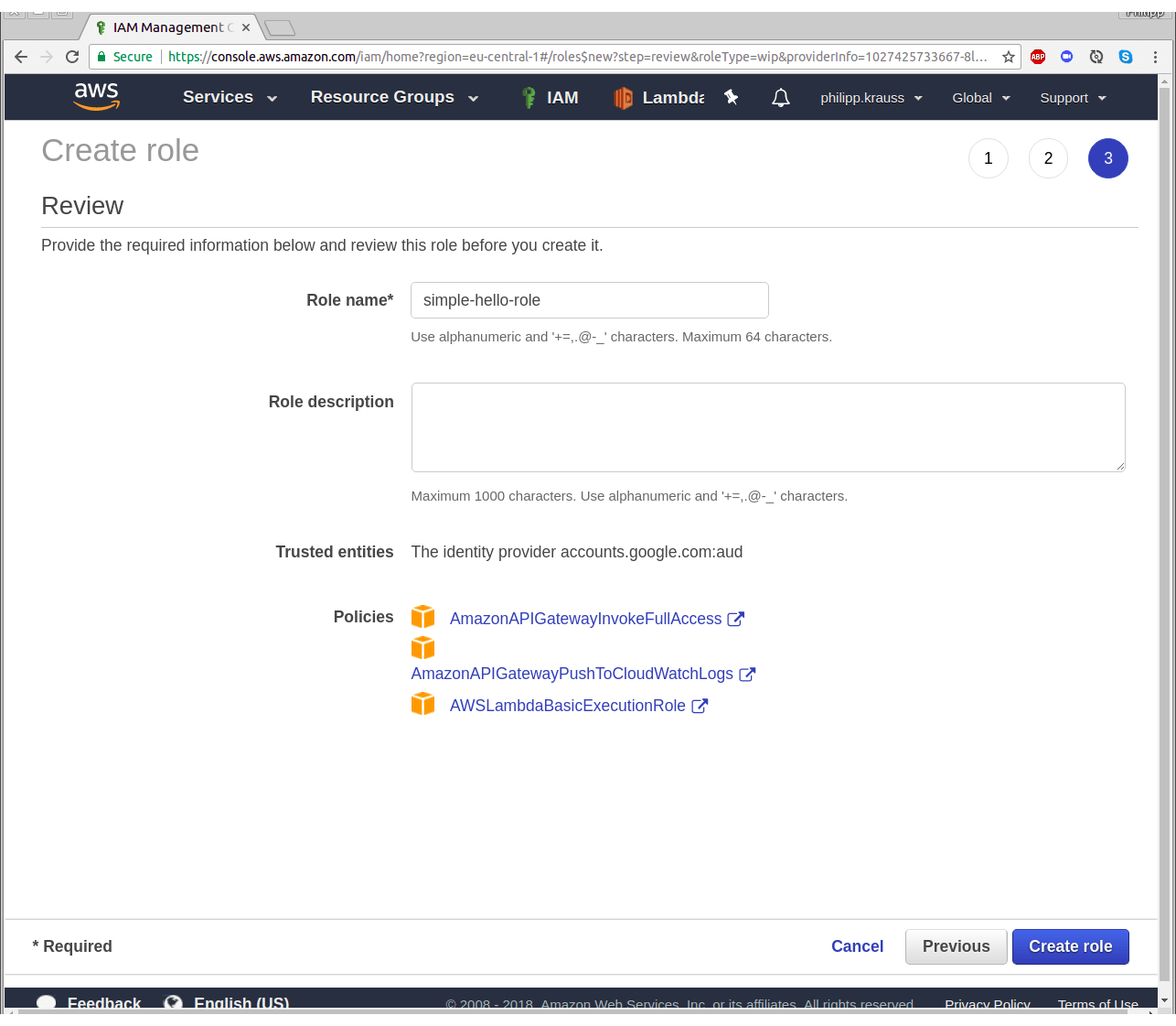 On the permissions page, add the permissions AmazonAPIGatewayInvokeFullAccess, AmazonAPIGatewayPushToCloudWatchLogs and AWSLambdaBasicExecutionRole by setting the check mark. Press “Next: Review” and finally, name the role “simple-hello-role” and create it.