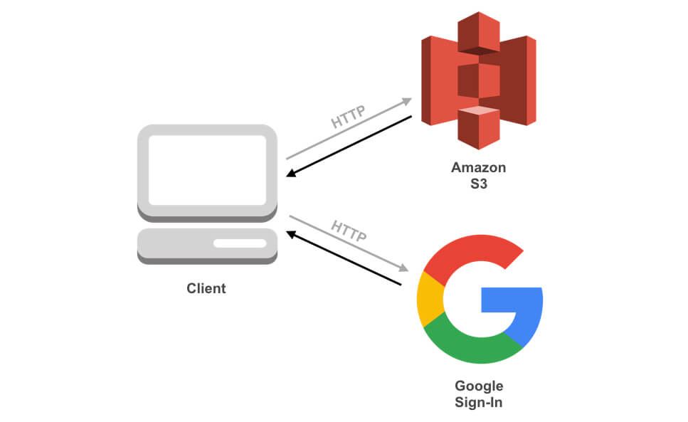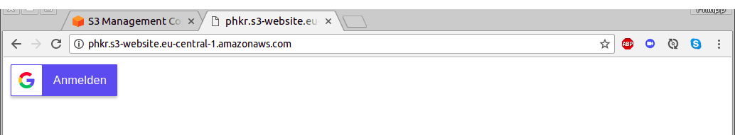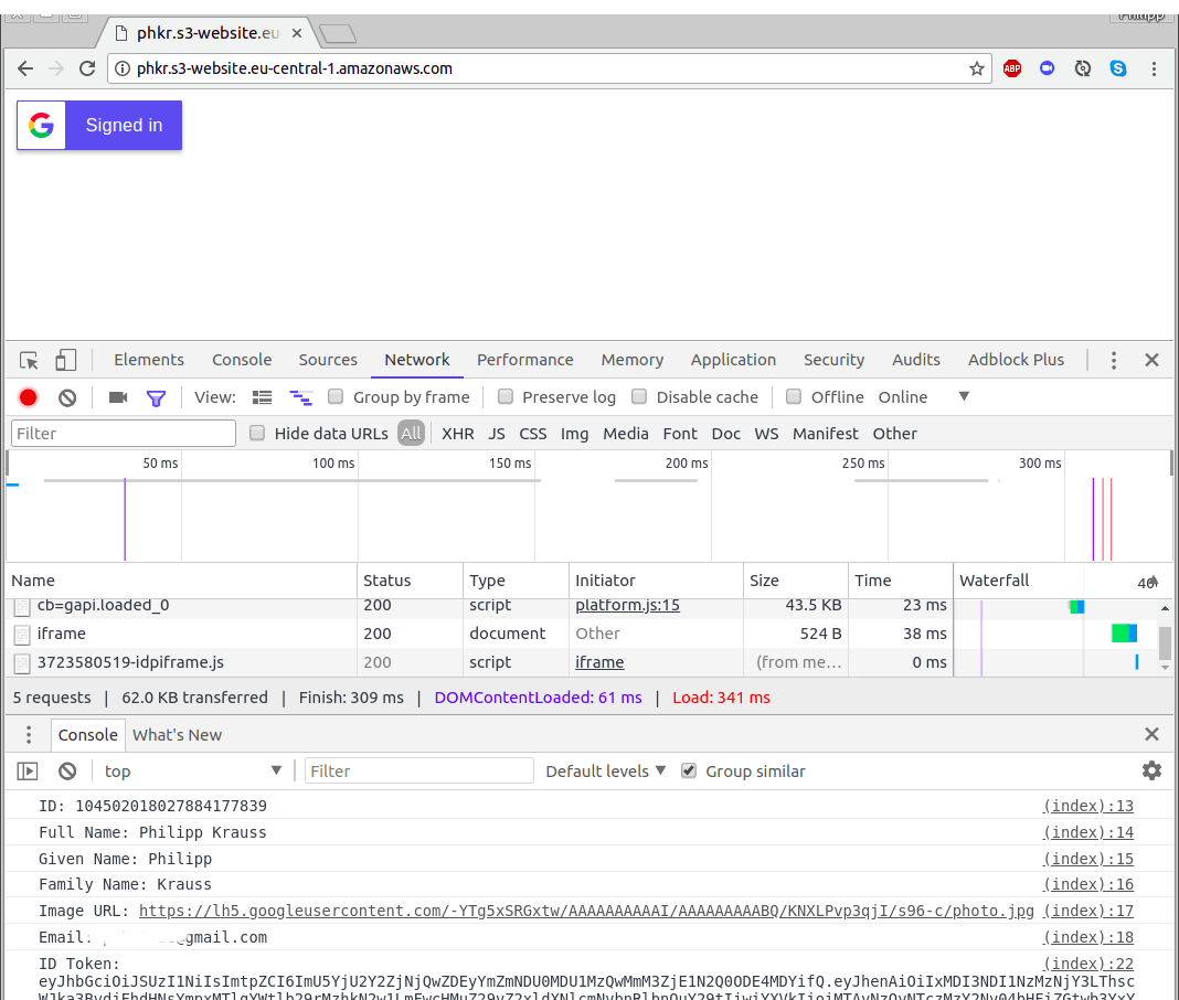Let’s start by using Google Sign-In. This is Google’s identity provider service. To access it, you will host a small static website in an AWS S3 bucket that displays a “login with Google” button. This website will print out the Google authentication information so you can note it down. Using an S3 bucket is necessary because Google needs to know the URL under which the login button will be, and an S3 bucket gives us a fixed domain name.