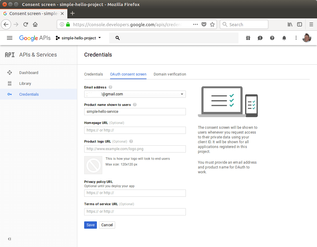 Next, go to “Credentials” → “OAuth consent screen” to configure an OAuth consent screen. As product name, enter “simple-hello-product”. Press “Save”.