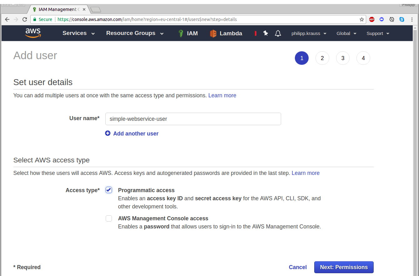 To get such an API key, let’s generate a dedicated AWS user. In the AWS console, open the IAM service, navigate to “Users” and select “Add user” to create a new user for this purpose. Enter the User name “simple-webservice-user” and as Access type, select “Programmatic access”.