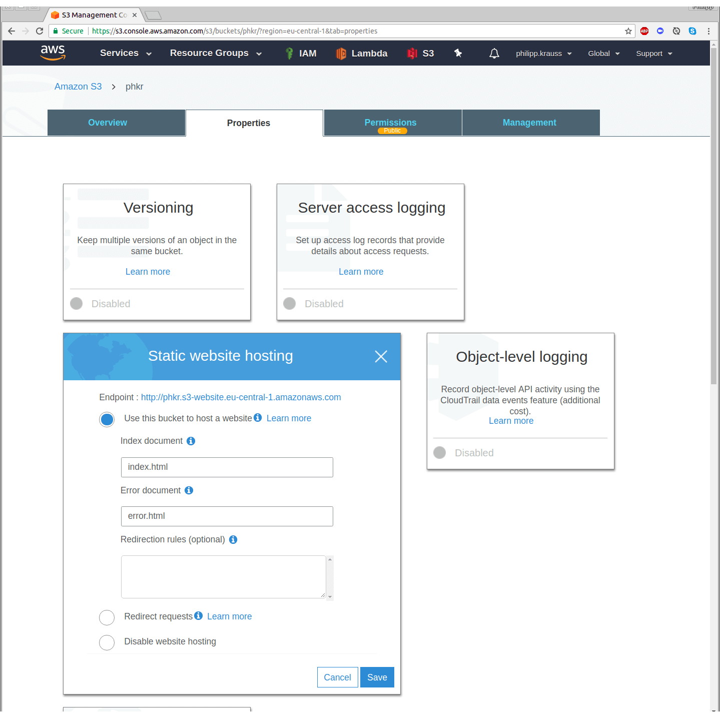 Once the bucket is created, select it by clicking on its name and go to “Properties”. Select “Static website hosting” and enable “Use this bucket to host a website”. Use ”index.html” as Index document and “error.html” as Error document.