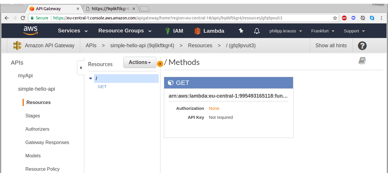 On the next page, press “Actions” → “Create Method”. Select “GET”.