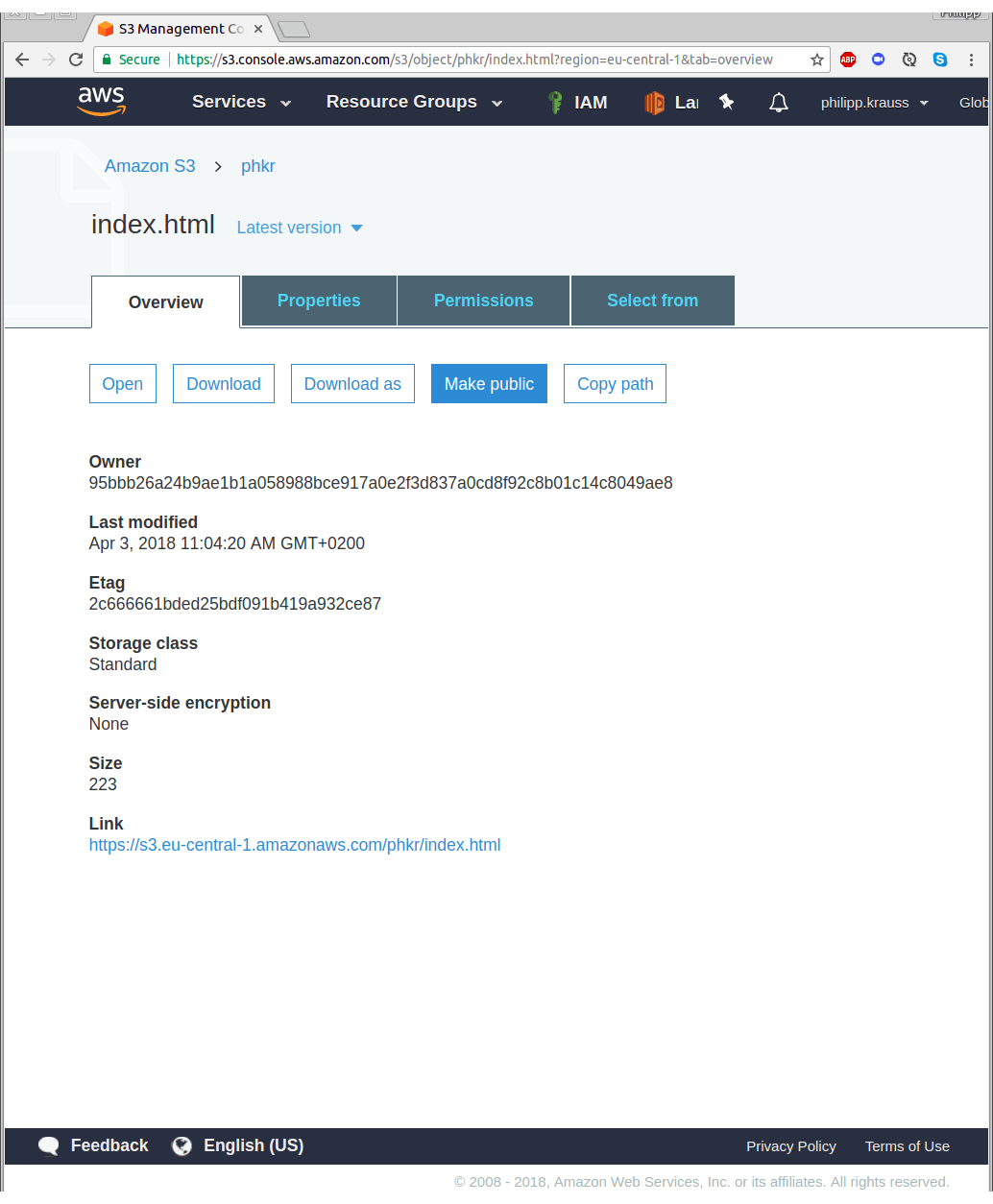 Instead of the “YOUR_CLIENT_ID.apps.googleusercontent.com” placeholder, enter the Client ID from the previous steps. Now, upload the file to your S3 bucket and make sure it is public. Therefore navigate to S3, click on the name of your bucket and press “Upload”. Select your index.html and you’re ready to upload the file. Click on the name of your file and then press “Make public” to enable users to access the page.