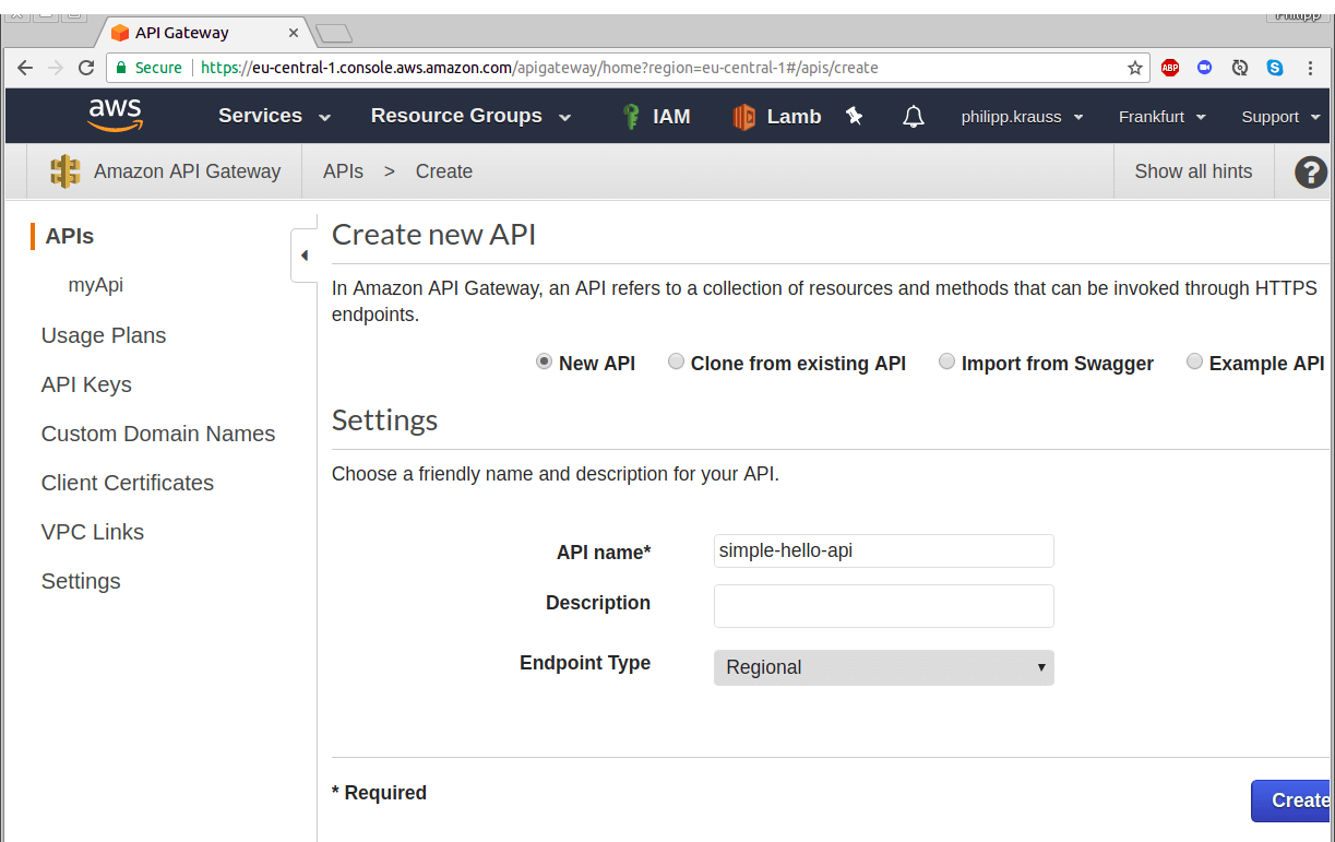 The next step is to create the API in API Gateway. In the AWS console, navigate to the API Gateway service and start to create a new API. If this is your first time working with the API Gateway, AWS will show you an example API. Just select the radio button “New API” to start creating your own.