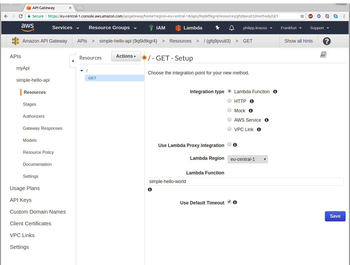 Here you can now integrate the Lambda function that you created before. Therefore enter “simple-hello-world”. As soon as you start entering the name, you should be able to select it directly. Press “Save”. This will trigger a box to inform you that API Gateway will receive the permission to execute your Lambda function simple-hello-world. Select “OK”.