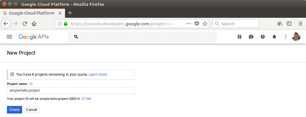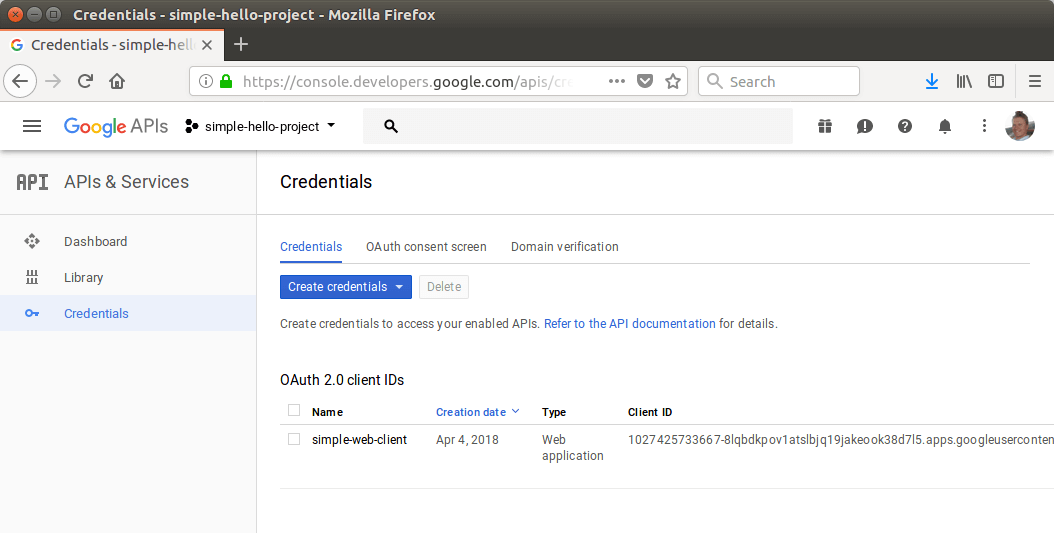 Next, you have to configure Google Sign-In. Go to https://console.developers.google.com and create a new project. Name it “simple-hello-project” and press “Save”.