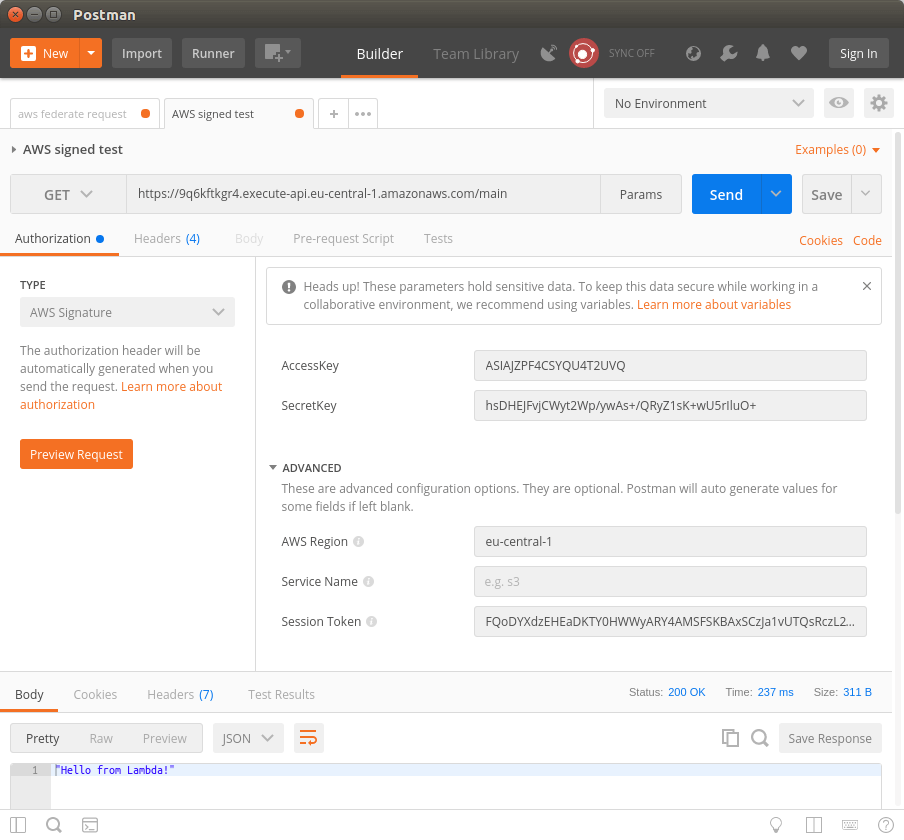 If you entered the right keys and region, you will get the “Hello from Lambda” answer from the API. The web service is now secured and can only be accessed by authorized users.