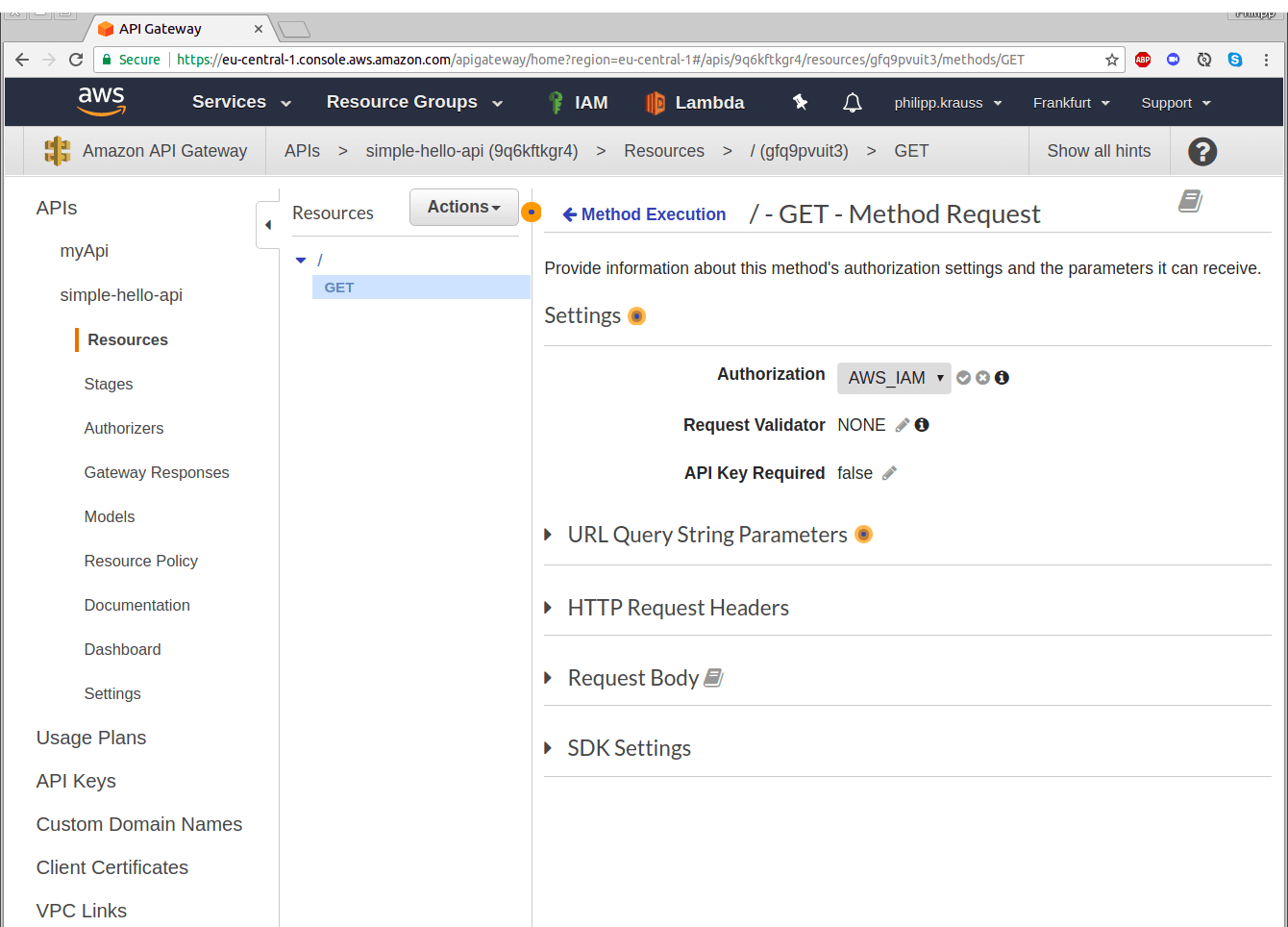 To change this, click on the GET, then select “Method Request”. Change the value of Authorization from “NONE” to “AWS_IAM”. Click on the small check mark to save your change.