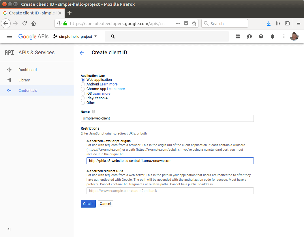 Go back to the “Credentials” tab and select “Create credentials”. Select “OAuth client ID”. As Application type, select “Web application”. As name, enter “simple-web-client”. In Authorized JavaScript origins, enter the S3 Endpoint URL. Press “Create”.