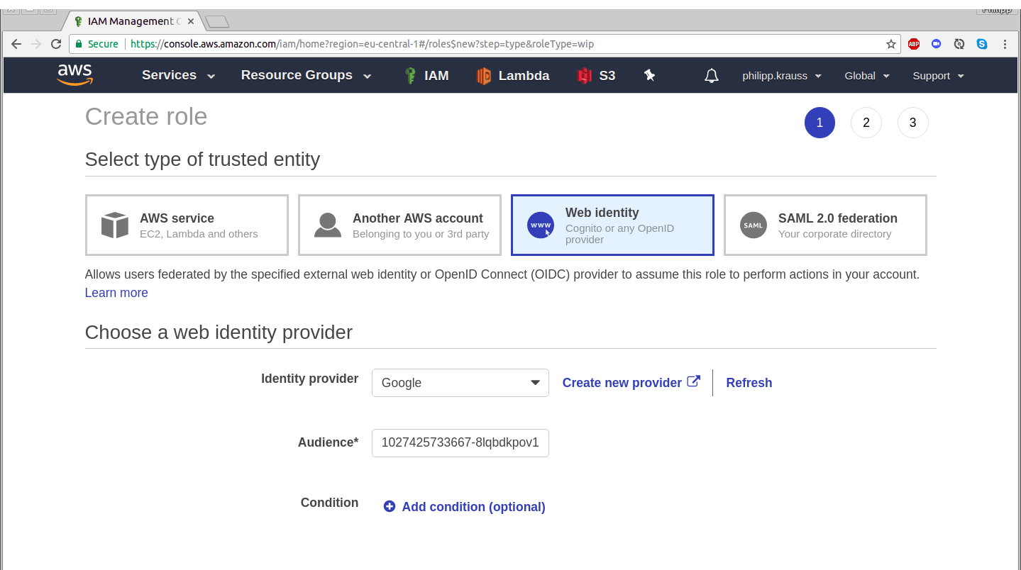 In the AWS console, go to IAM → Roles. Select “Create role” and select “Web identity”. As Identity provider, select “Google”, as Audience enter the client ID copied in the previous step.