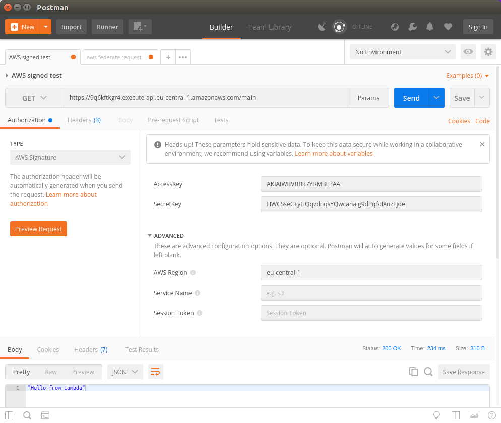 From now on, the browser is not enough any more to access the web service. It is now time to switch to Postman and test the API. You can of course use any REST client, but Postman already has the functionality included to generate AWS authentication headers based on API keys. Enter the Access key ID and Secret access key that you copied before. Also make sure to use the correct AWS region of your API in the Advanced section of the authorization configuration, otherwise it will not work.