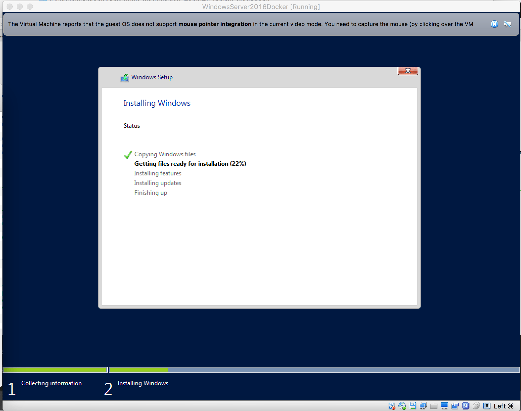 After installing Virtual Box , Vagrant and Packer (which can easily be accomplished via brew cask install virtualbox, brew cask install vagrant & brew install packer if you´re on a Mac), check out the repository and cd into step0-packer-windows-vagrantbox . Also download the Windows Server 2016 14393.0.161119-1705.RS1_REFRESH_SERVER_EVAL_X64FRE_EN-US.ISO and place it into the current step0-packer-windows-vagrantbox folder. Now start the Packer build with the following command: