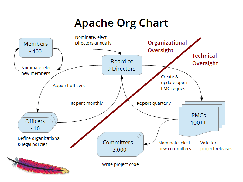 Another responsibility of the PMC is to prepare a quarterly report for the Board of Directors, informing the board about the state of the project. Such a report contains information about new committers and PMC members, successful releases, and anything else which may be of interest to the board. The quarterly report provides an opportunity to ask the board of directors for help if a project has problems it cannot deal with on its own. This can be, for example, incapacity due to a lack of active community members or internal conflicts among project members which cannot be resolved. I’ve to admit that I haven’t experienced such a situation until now.
