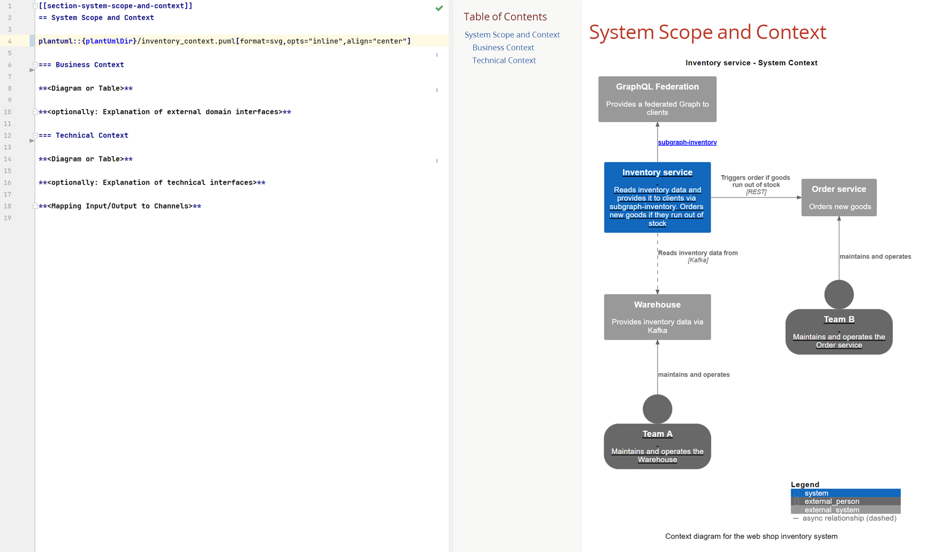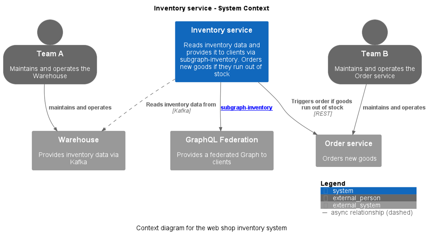 We will document a fictional application called “Inventory Service”. The Inventory Service is part of the backend of an online shop. It's responsible for providing meta information regarding the available goods like name, description and the available amount in stock. The Inventory Service receives this information from a system called "Warehouse" and provides the data to clients via GraphQL. Furthermore, if a good runs out of stock, the Inventory Service triggers a system called "Order Service" via a REST API call to order new goods.