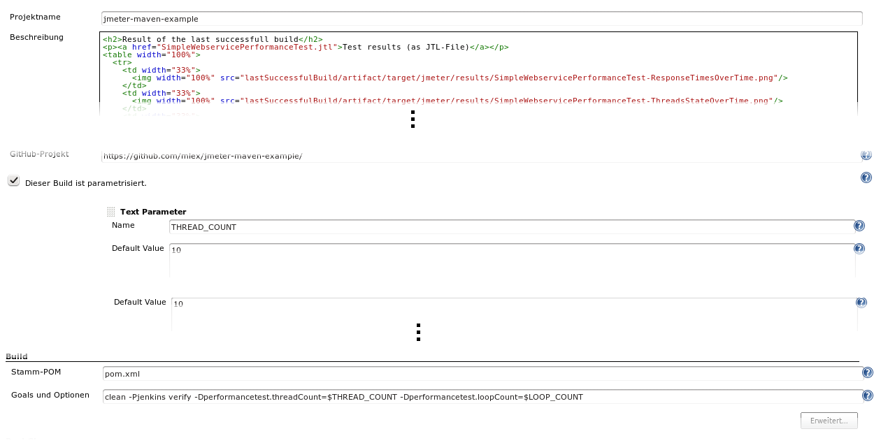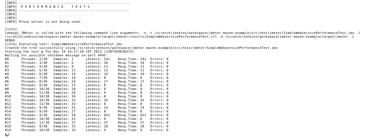 The following code- and configuration-snippets are taken from the example project jmeter-maven-example , which is available on GitHub. There is also a public jenkins with a simple job, that allows executing JMeter tests against a real application (hosted on CloudBees).