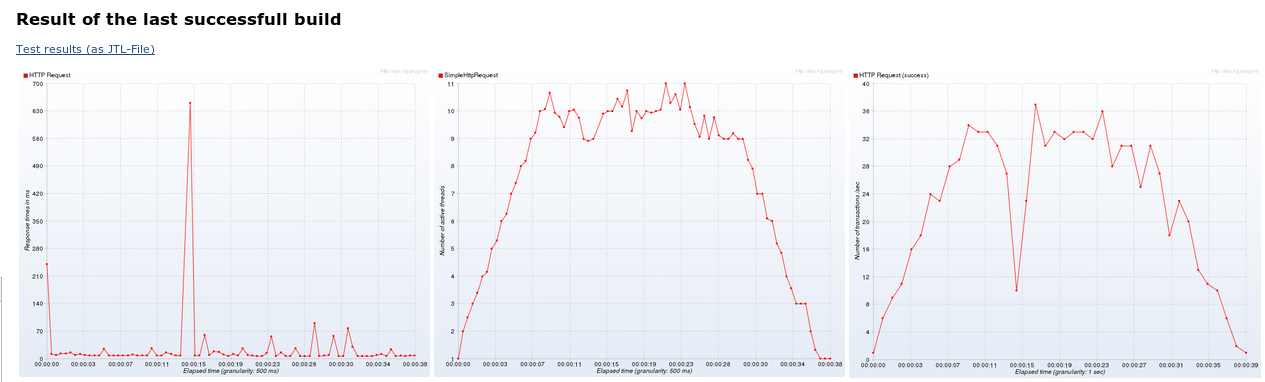 What meaningful reporting looks like, always depends on the concrete requirements. Sometimes it makes sense to regularly run equally sized load tests, so that you get instant feedback whenever a change in the system considerably effects performance. In this case, the Jenkins Performance Plugin is a good choice. However, I was more interested in graphs that show the system behaviour over time. Those graphs can be easily created from command line using the CMDRunner tool of JMeter Plugins. With the help of a small Maven plugin, the jmeter-graph-maven-plugin , it is possible to easily integrate this graph-generation in a Maven build.
