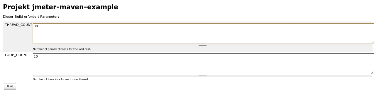 Now that we have different Maven profiles for the various environments, the configuration of an appropriate Jenkins job is just a small step. The parameterized builds are another nice feature of Jenkins, that is very useful for JMeter tests. Parameters can be used for example, to allow users to define the size of the load test (that is: the number of threads and iterations).