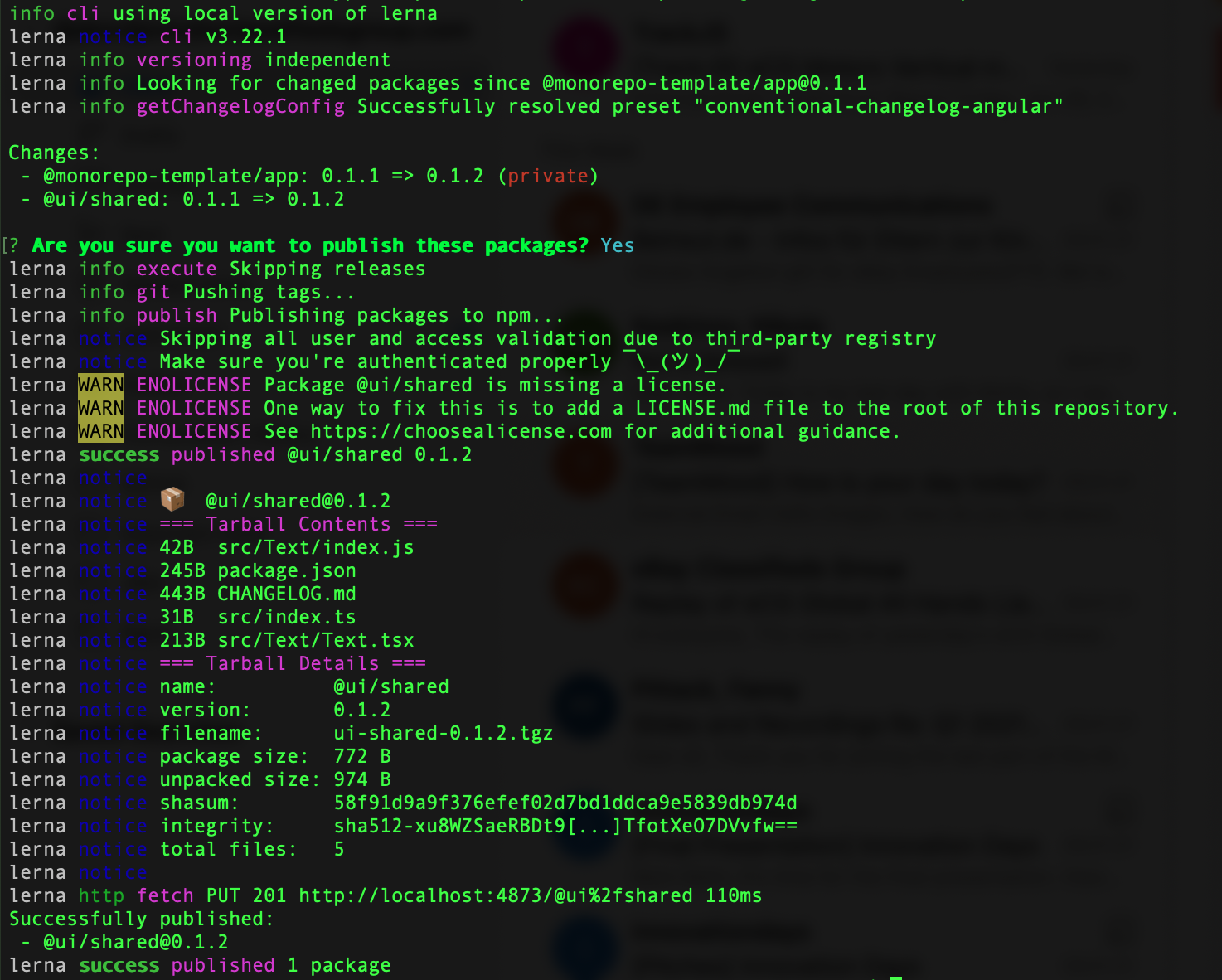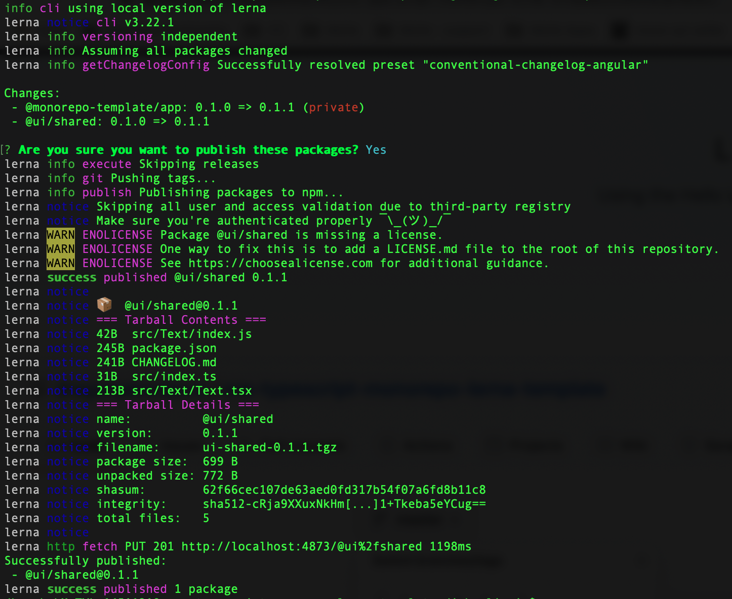When run, this command calls lerna version behind the scenes. A few seconds later, our console output should inform us that we have successfully published the shared package: