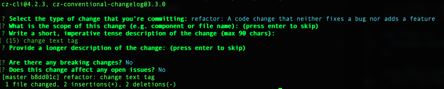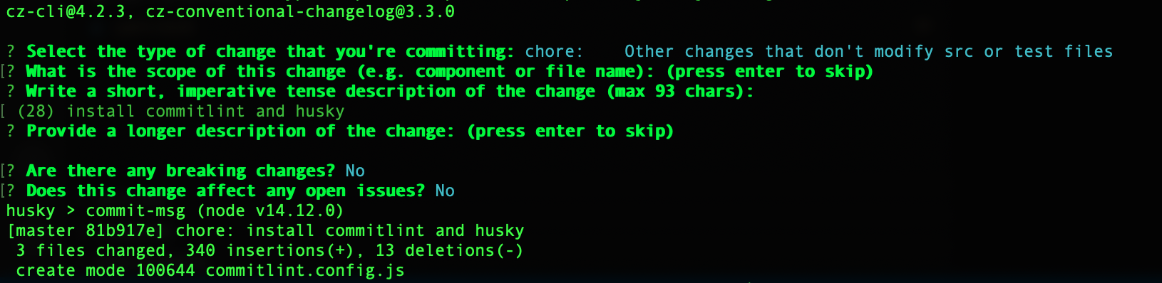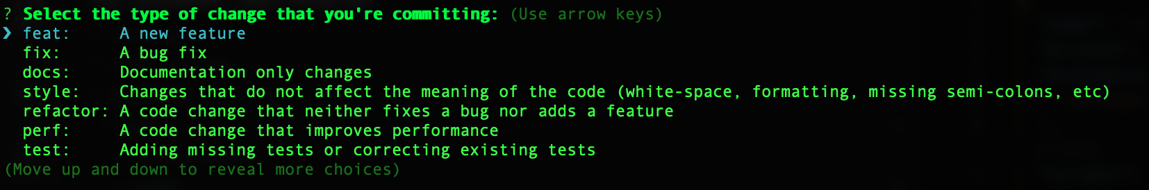 It is possible to write commits in conventional style, but why bother? Commitizen can help us format commit messages with a series of prompts that are used to generate a commit message. Later, these commit messages will be analyzed to determine the next version.