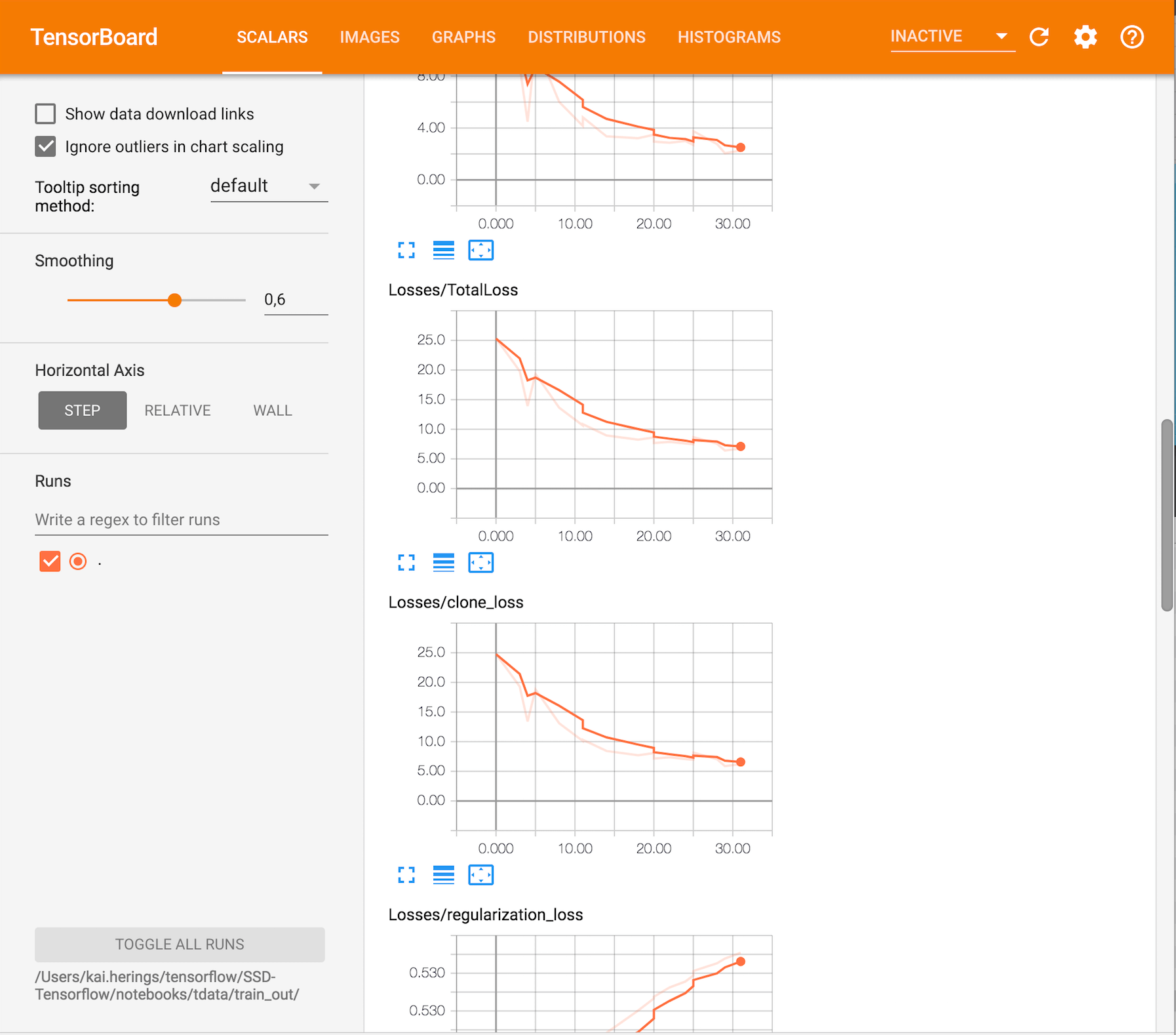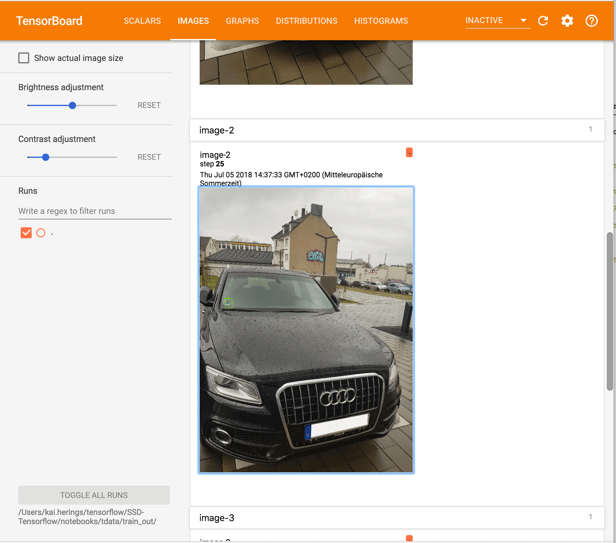 Tensorboard is used to monitor/visualize the training. It displays information about the performance of the training and the evaluation set images that were processed by the detector. Furthermore, the structure of the model can be displayed.