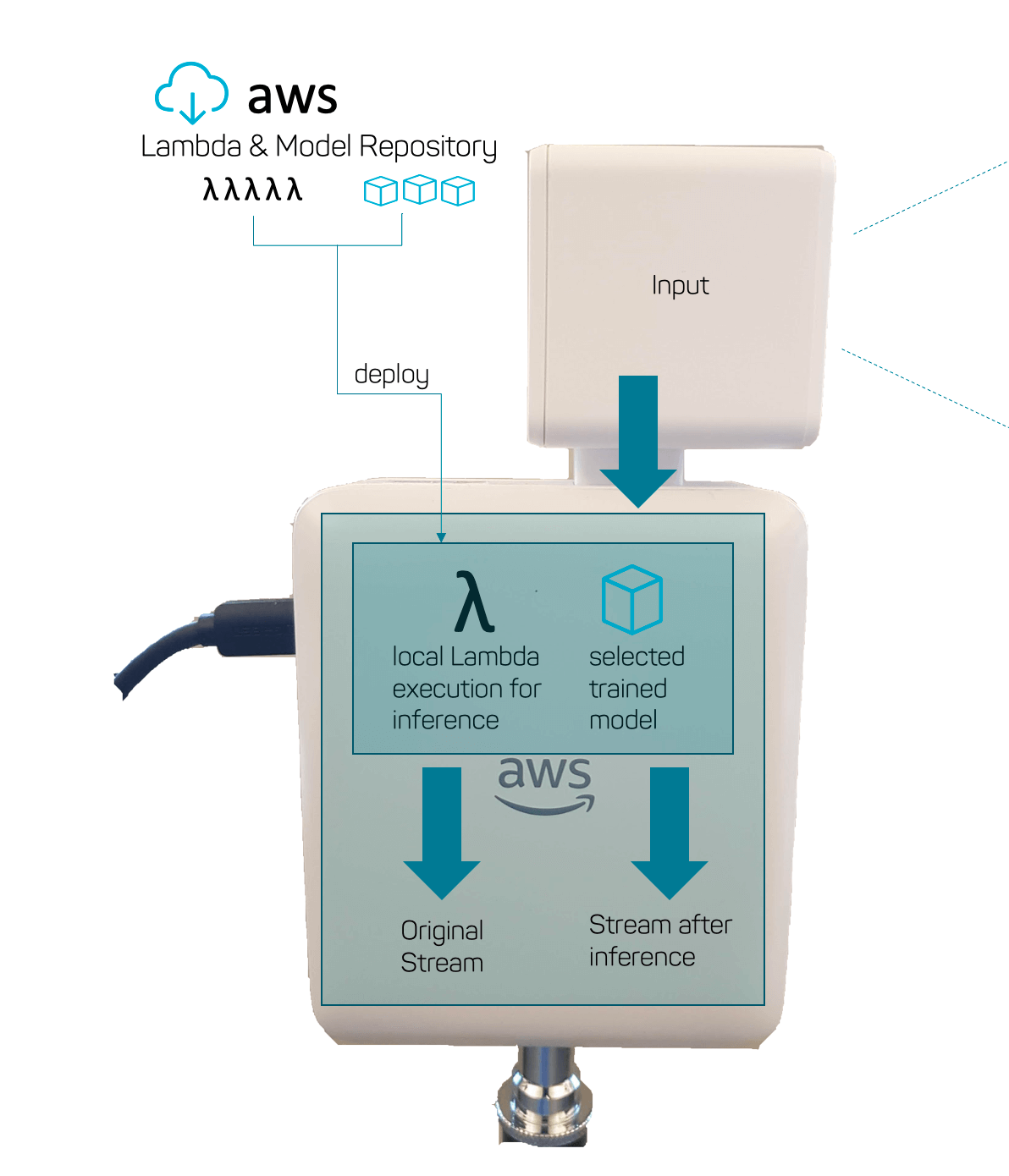As hardware platform, we use an AWS Deeplens, which our colleagues brought along from the last re:Invent. The “Deep Learning Camera” is well suited for testing in our scenario for various reasons: it works stand-alone just with power, has an Intel Gen-9 GPU, support for multiple machine learning frameworks, built-in WiFi, and integration with AWS IoT messaging services, logging, easy deployment and more. AWS Deeplens runs Ubuntu Linux and can be connected to a monitor, keyboard, and mouse if required. Both the input and the output stream (after inference by our trained detector) can be accessed locally or via stream if required.