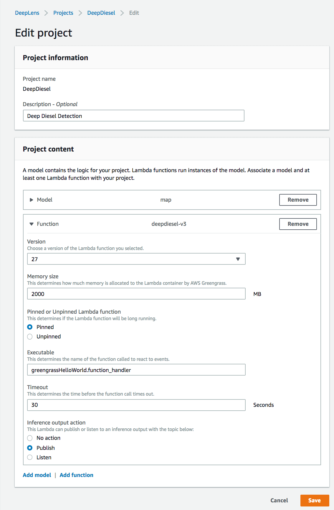 We create our own empty AWS Deeplens project with a custom model. Now we have to specify the model we want to upload and create a lambda function that detects AWS Deeplens (inference).