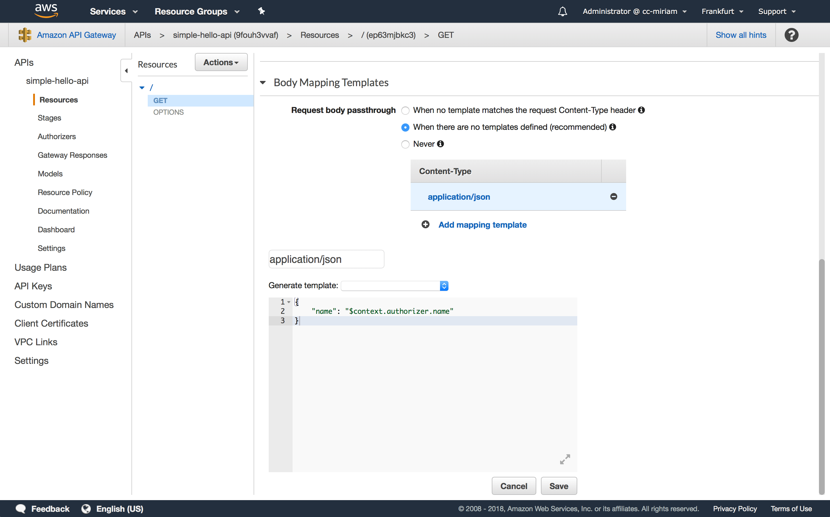 Switch to the API Gateway of your simple-hello-api to define a mapping template. Navigate to “Resources” -> “GET” and then click on “Integration Request”. Here you can now specify a body mapping template. Select “When there are no templates defined (recommended)” and add a mapping template called application/json. Then scroll down to add the actual content of the template.