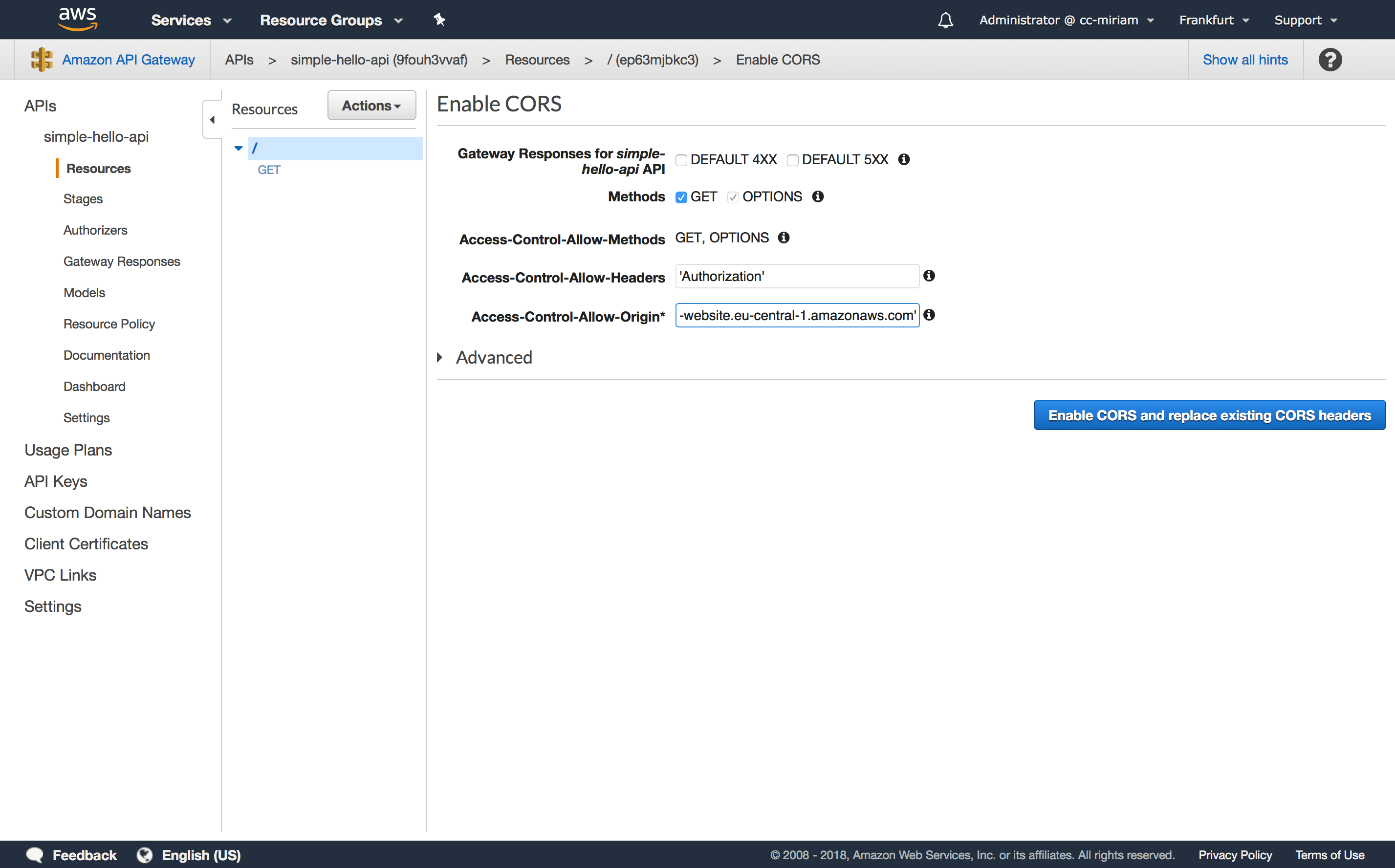 As last step to make your API call work, you have to enable CORS (Cross-Origin Resource Sharing) for your API. Navigate back to the API Gateway and your simple-hello-api. Click on “Resources” and then “Actions” and select “Enable CORS” from the drowndown menu. As “Access-Control-Allow-Header” enter ‘Autorization’ and as Access-Control-Allow-Origin, enter your S3 Endpoint URL in single quotes. Make sure that it does not have a slash at its end.