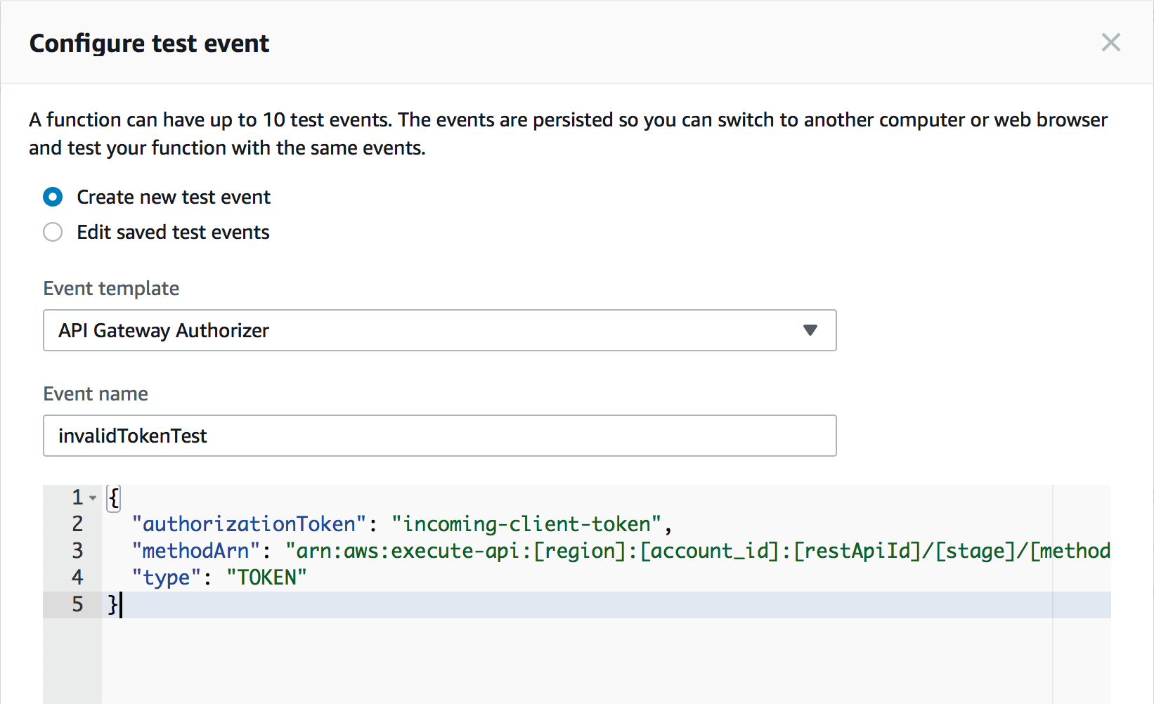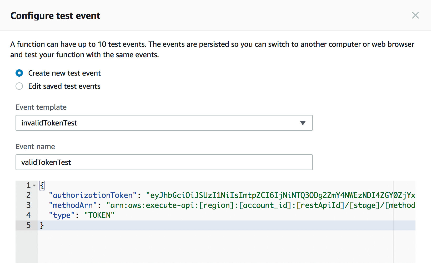 You can now test your Lambda function to make sure it works. First, let’s test your Lambda function with an invalid token. Click on the dropdown menu next to the “Test” button and click on “Configure test event”. Make sure that “Create new test event” is selected. Then search for the Event template “API Gateway Authorizer” in the dropdown menu and select it. Finally, enter the name invalidTokenTest. For this test, you can just use the input created automatically by the template.