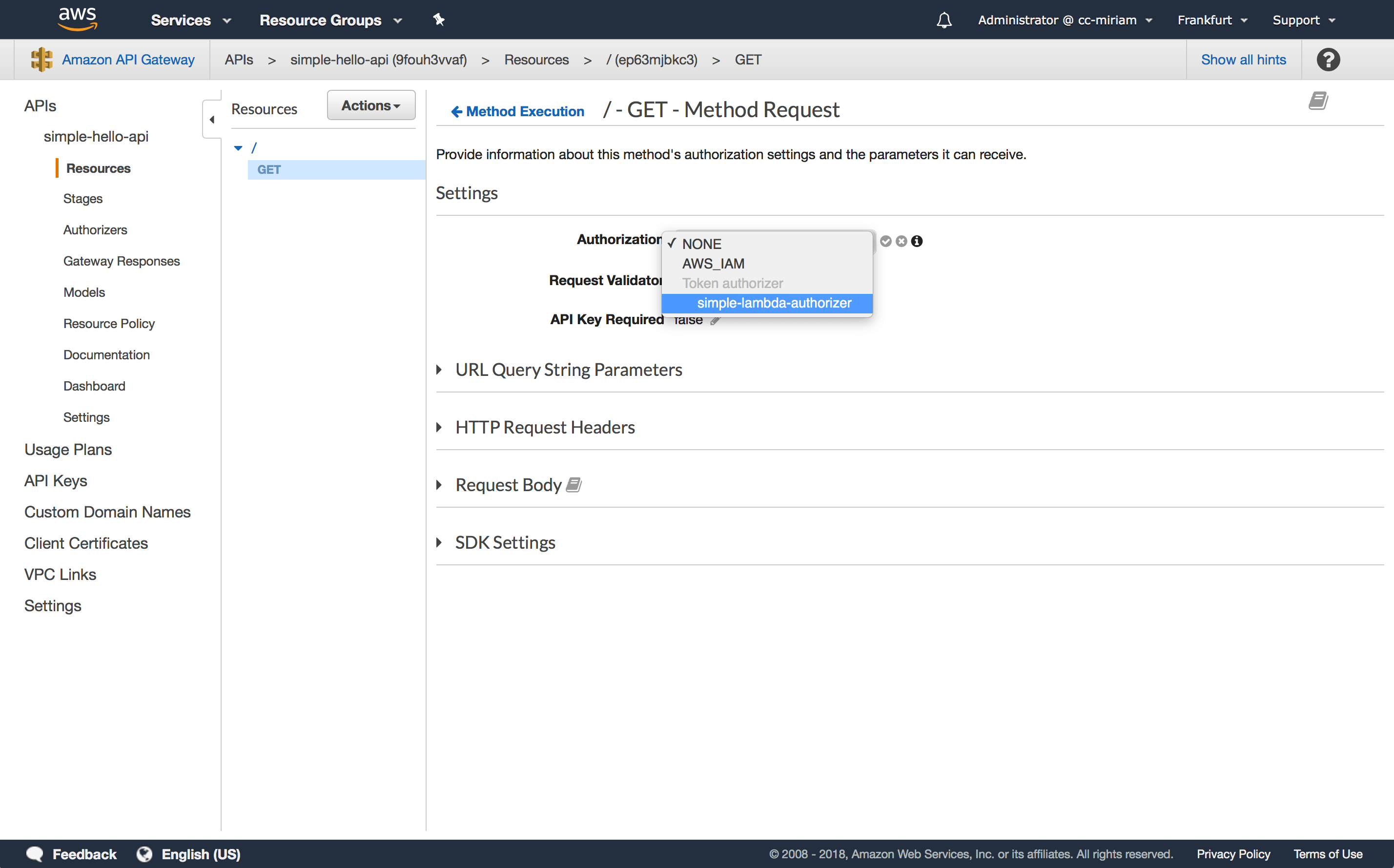 Although you created the authorizer, it is not yet hooked up to your simple-hello-api. To hook up your authorizer to your API, navigate to “Resources” -> “GET” and click on “Method Request”. Edit the Authorization settings and select your simple-lambda-authorizer. Press the checkmark to confirm. If you cannot select your authorizer in the dropdown menu, just reload the page and it should appear.