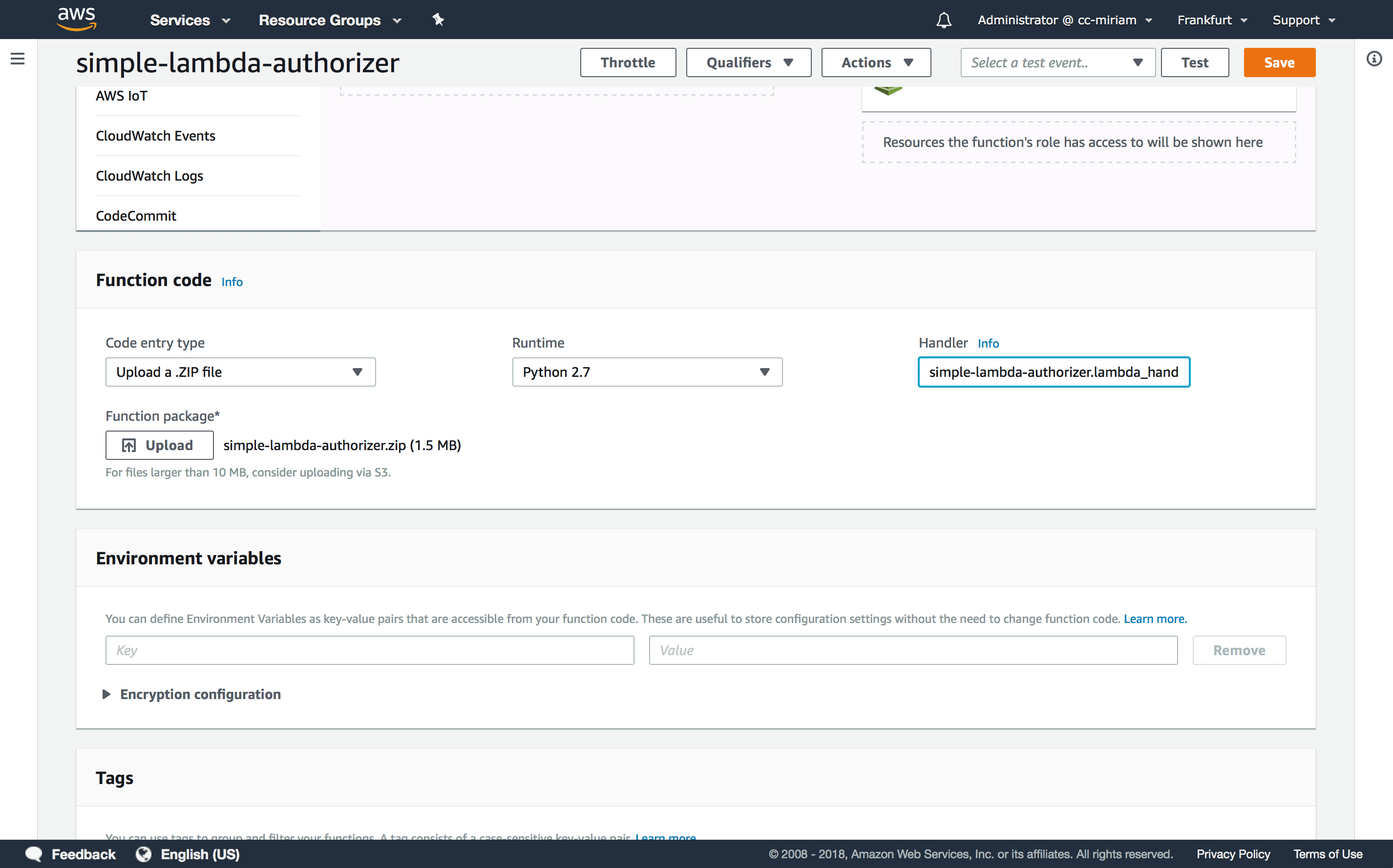 Call your Lambda function simple-lambda-authorizer and select “Python 2.7” as runtime. As a role, you can select the role you created for your simple-hello-lambda function which is the simple-lambda-role. If you are ready to proceed, click on “Create function”. Your function will be created containing example code.