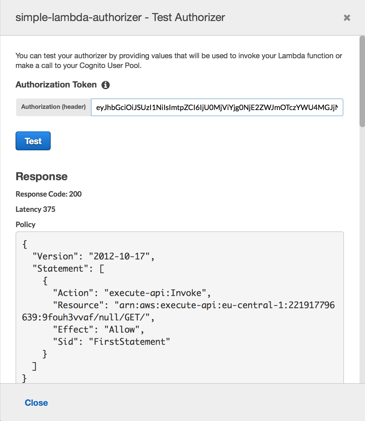 Press “Create” and in the following dialog click “Grant & Create” as you have to grant your API Gateway the permissions to execute your Lambda function. You can now test your AWS Lambda authorizer by clicking on “Test” providing different values for the Authorization header.