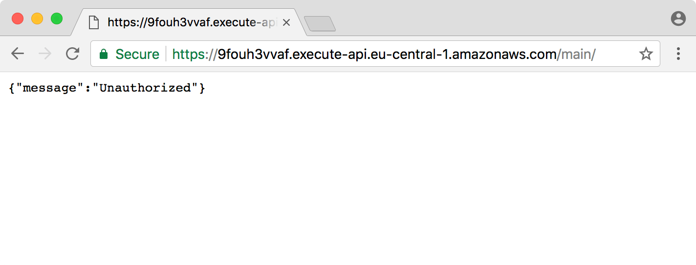 To reflect the changes in your API, you need to deploy your API again. To do this, select “Actions” -> “Deploy API”. Wait a few second to make sure that your API was deployed again. If you now try to access your Invoke URL, you will get a message that you are unauthorized.