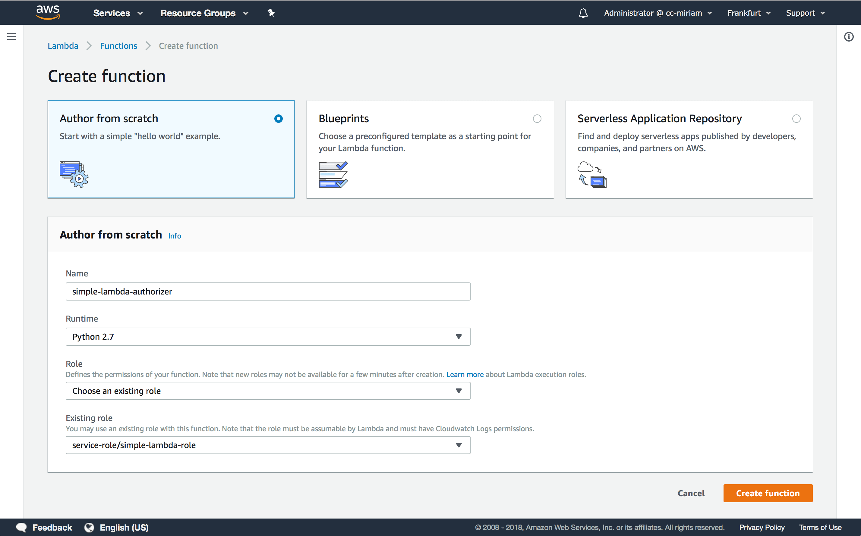 Navigate to AWS Lambda and start creating a function. There are blueprints for authorizers that you might want to use in the future, but for this tutorial they are way too complex. Therefore, select “Author from scratch”.