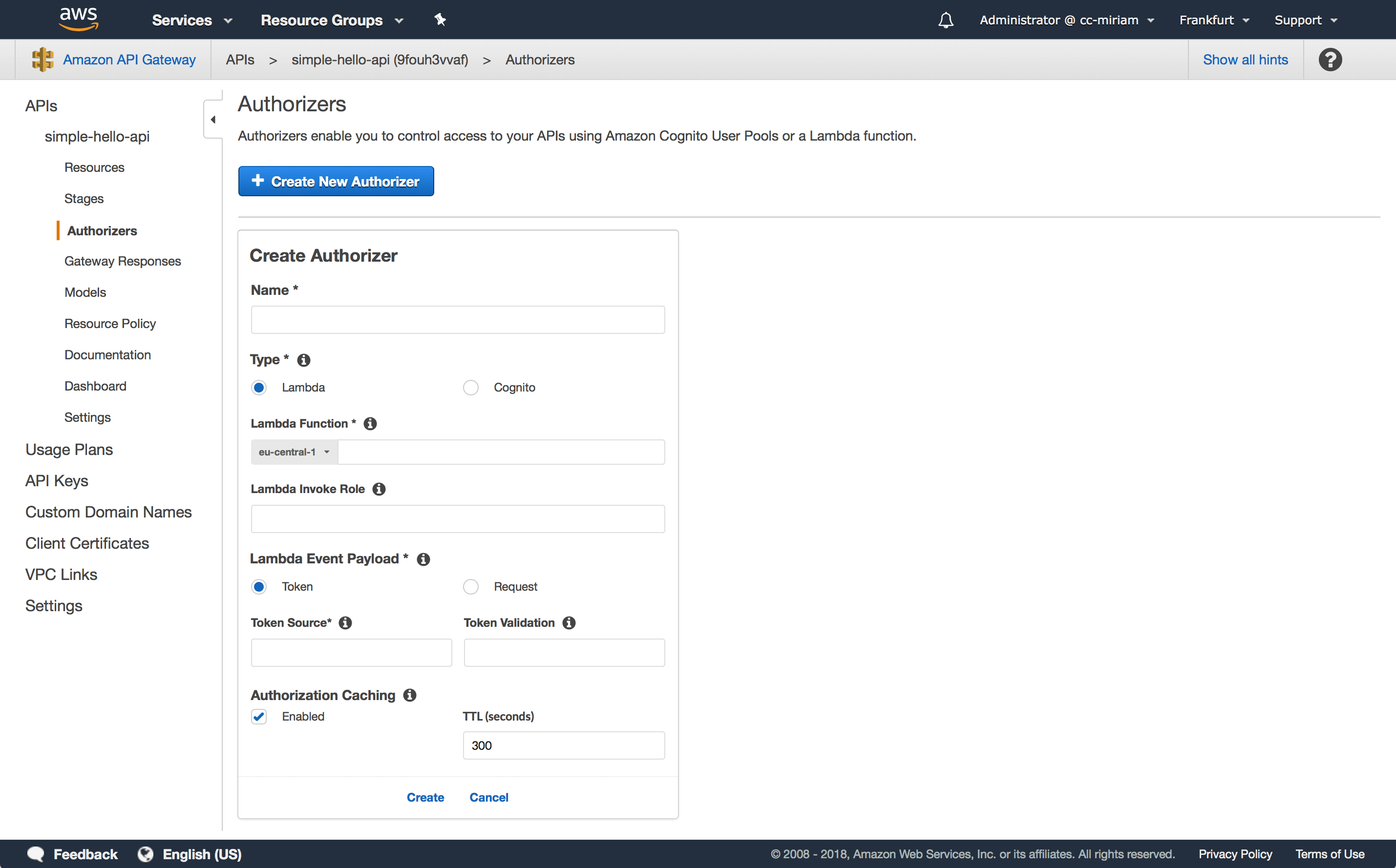 As you finished creating your Lambda function for the authorizer, navigate back to the API Gateway and your simple-hello-api. Navigate to the “Authorizers” sub menu, click “Create New Authorizer” and fill in the necessary information. As name pick simple-lambda-authorizer. When you start entering the name of your Lambda function in the corresponding text field, you should then be able to select your simple-lambda-authorizer. The only other property you have to specify is the Token Source. The token source is the name of the request header expected from your API Gateway to contain the token to authorize the user. Name it Authorization.