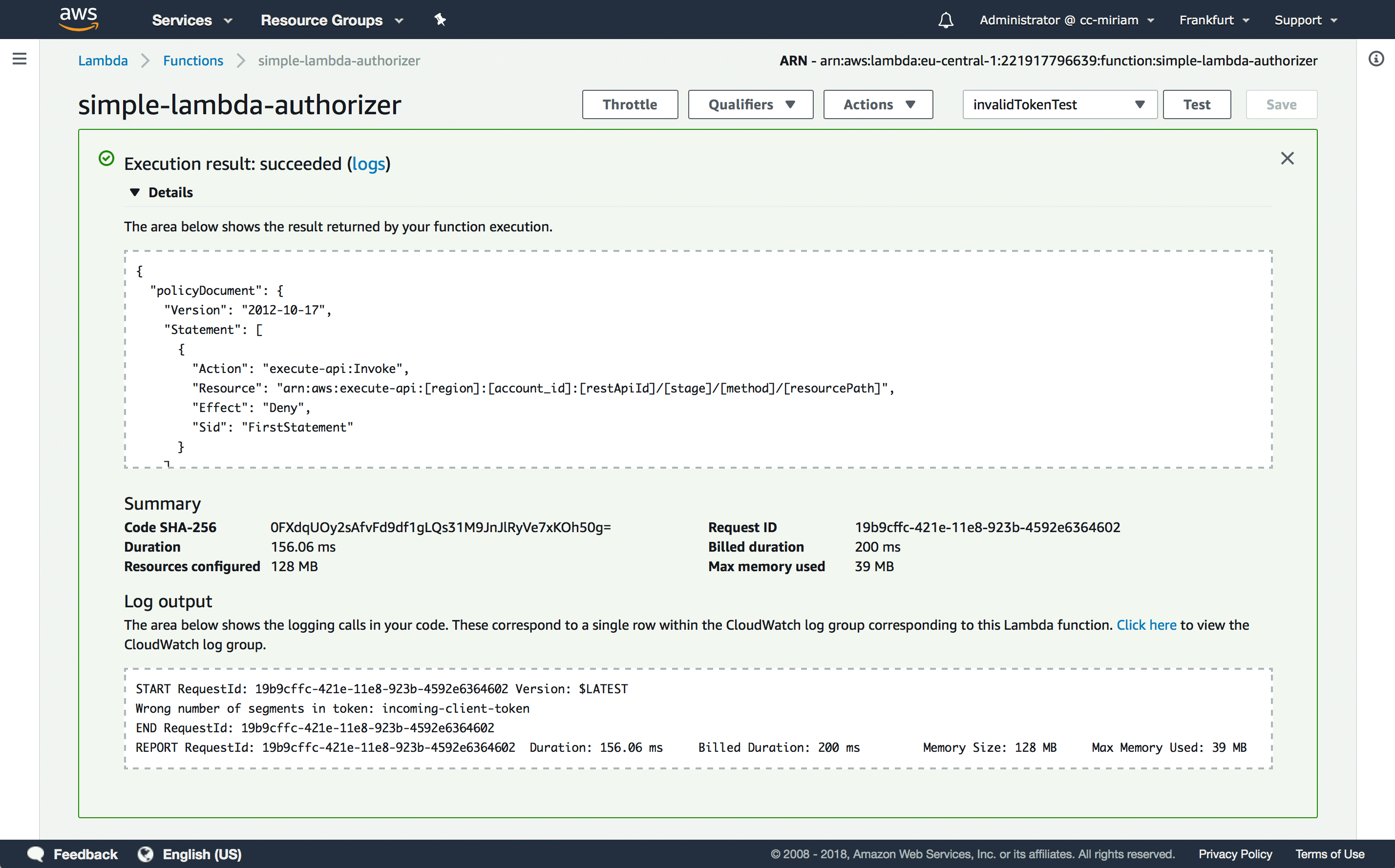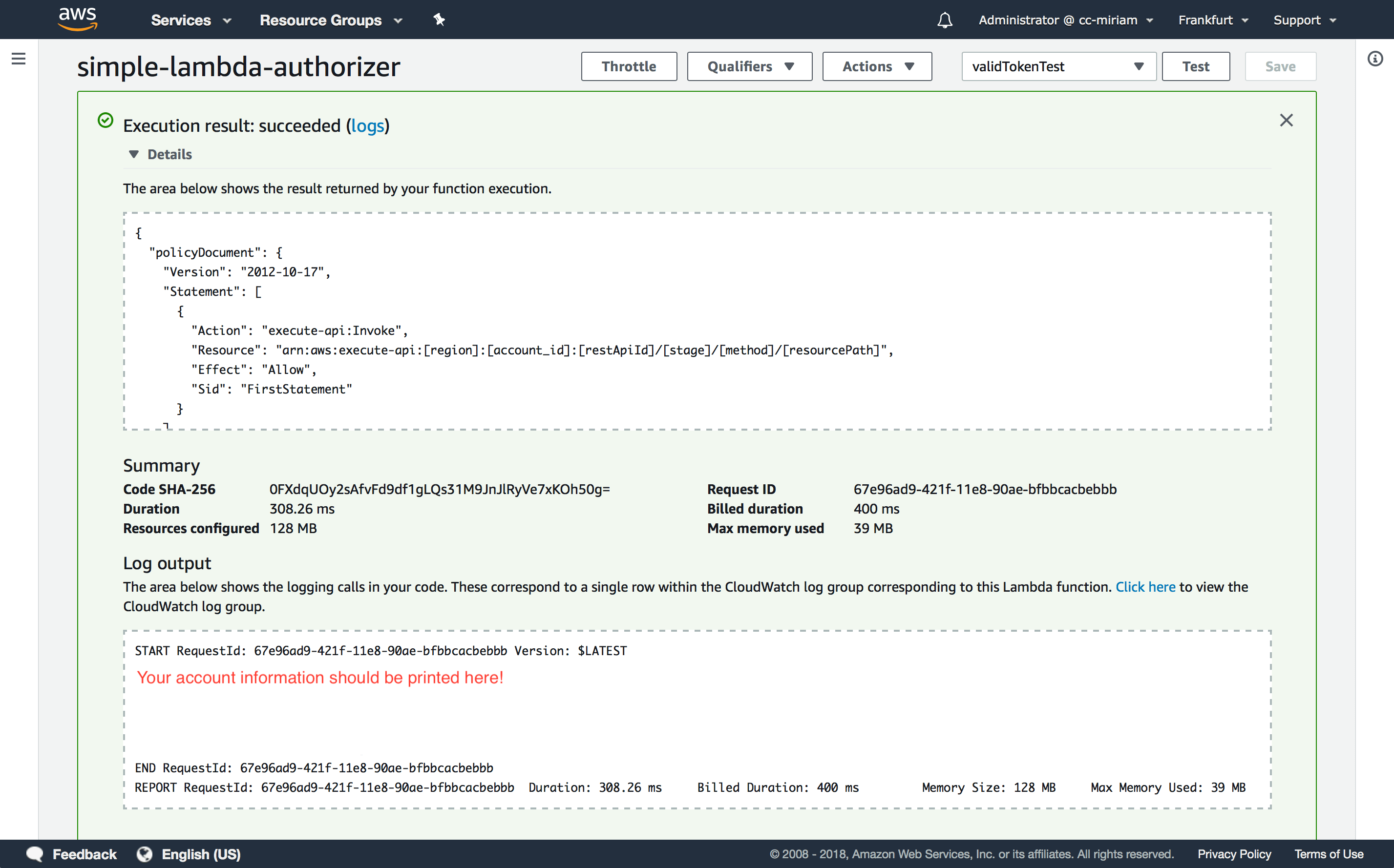 Click “Create” and “Test”. As a result of your test, the execution should not only succeed, but the created policy should allow the API usage and your account information will be printed in the log output. If not, your ID token might be expired, so just refresh your Sign-In page to get a new ID token and change your test event.