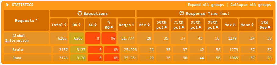 Each function was called around 3100 times within the two-minute time span. The time in the max column is the time of the first request when the Lambda function was cold. We can observe that the time until the first response is around 1.6 times as long for Scala as it is for Java. This observation holds true for multiple runs. The mean response time for both Scala and Java is around 38 ms.