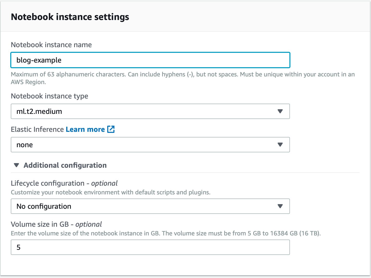 During the creation steps of the the SageMaker ML instance you define how much instance storage you want to assign. It needs to be enough to handle all the ML data that you want to work with. In our case we assign the standard 5GB. At this step you should be aware that this instance is different from the training instance, which you will spawn from your notebook. The notebook instance might need much less of storage and compute power than the training instance. Often it is enough to use a small instance for the data preparation steps and not an accelerated one.