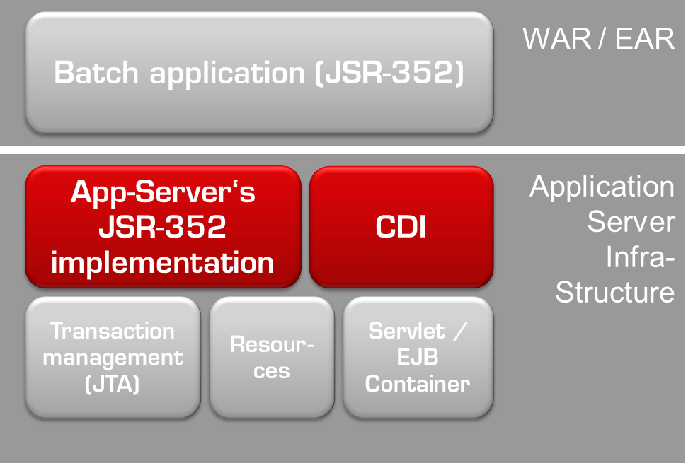 The architecture for running JSR-352 batch jobs in your JEE application server with Spring Batch looks like this: