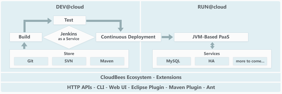 The DEV environment offers services for Jenkins, Maven and source control with Git and Subversion – you can also integrate your tool (like GitHub) if you want. Besides this it offers a runtime environment for Java applications including a relational database, so that you can deploy your application directly out of the CI environment into this PAAS solution. The CloudBees platform has some unique features for elastic scalability and availability that everybody will value if you have tried to manage a big CI environment by our own.