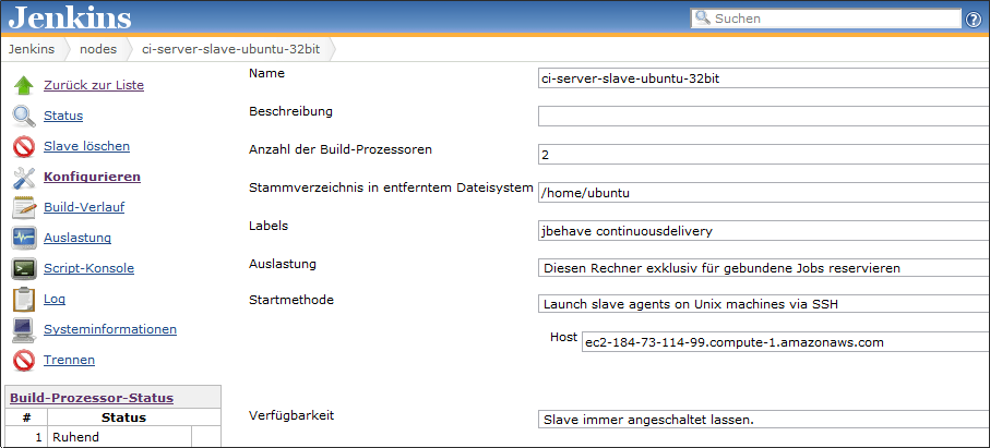 After successful Jenkins installation and set up, master-slave relationship mentioned above has to be established. In Jenkins Manager console I registered a new slave node and configured it respectively.