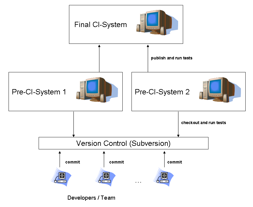 Having some experience one might be able to see one problem in the setup shown above. There is a lot of responsibility put on each individual developer to ensure that the build will not be broken. This means that ideally every developer must be able to run all tests – including integration tests – locally before committing any changes. I think this is fine for a small team of five to eight developers. Of course it is possible to scale a CI-System up and thus tackling those problems with a more technical approach. One possibility here is to setup a hierarchical build system, where developers are not directly committing to the product or project, but the code is verified in a Pre-CI-System. Only code that has been successfully verified there is committed to the final CI-System, where it is then tested again in the official build.