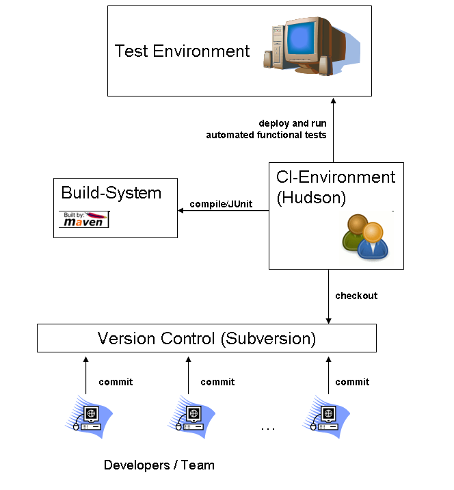 why we decided in the end to use Hudson as a tool, which is to some extend personal preference as with most tools. Helpful? I do not think so! So let’s have a last try for some answer: “Yes, we are using Hudson as a part of our Continuous Integration environment together with a corresponding concept for SCM and automated tests.” Better, but there is lot more to tell on Continuous Integration and thus we are at the beginning of this small series of articles on this topic.