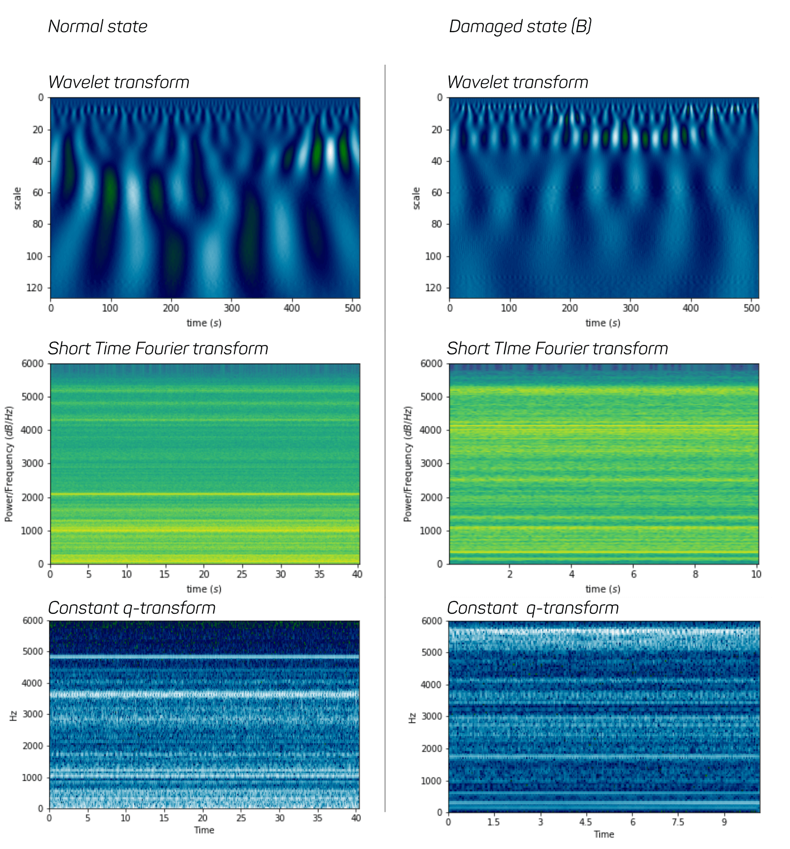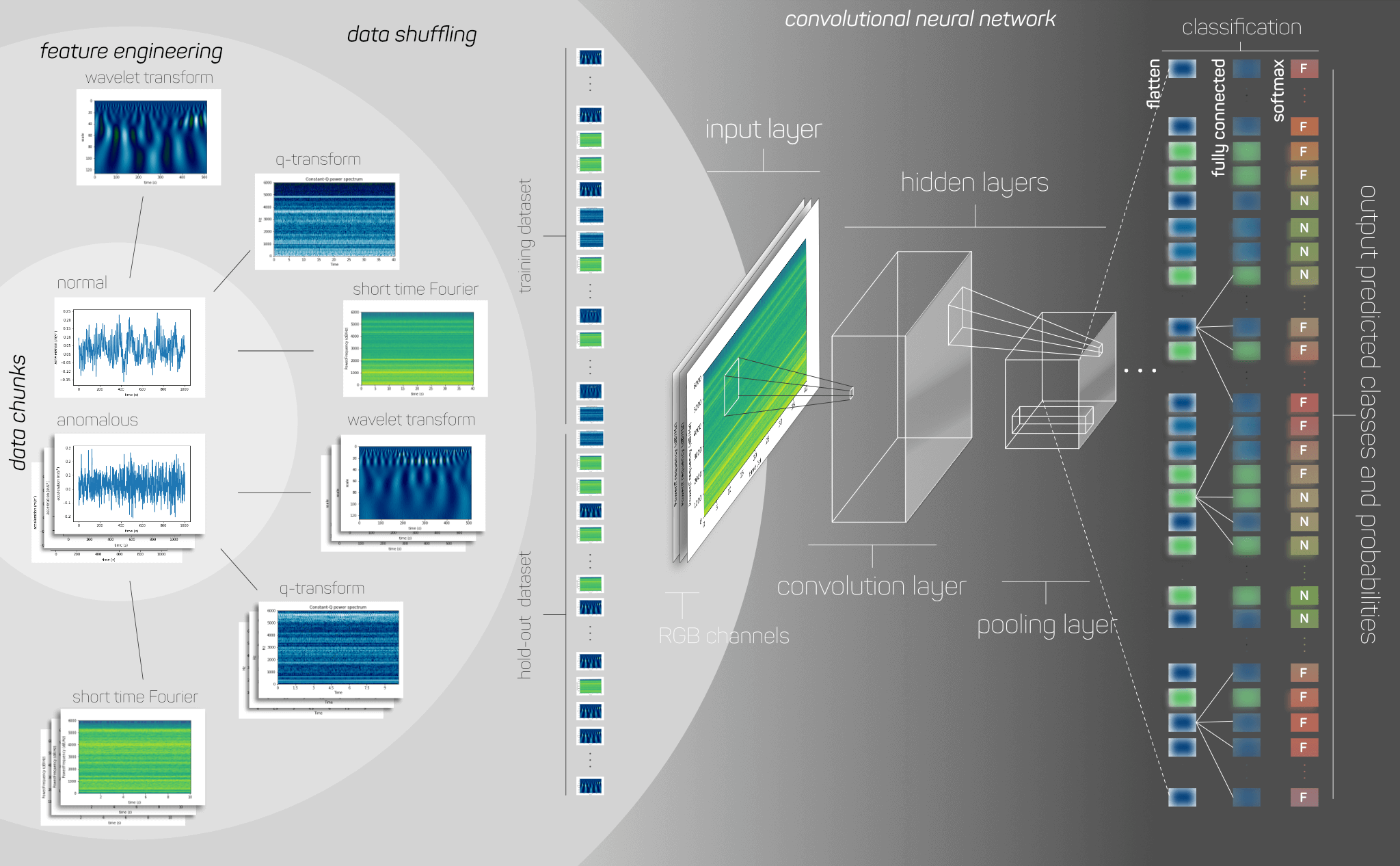 We apply standard tools of signal processing analysis, (wavelet, short time Fourier and q-transform) to extract features. For each small time series we extract three images, one for each transform, labelled in accordance with the original data, either (N) or (IR, B). The idea of this preprocessing operation is to have images that represent the coupled time-frequency domain. We show in the following the results obtained by training one specific CNN architecture based on the short time Fourier transform. Other kinds of signal preprocessing (like audio signals) might take advantage of the q and wavelet transform and are included in the repo .