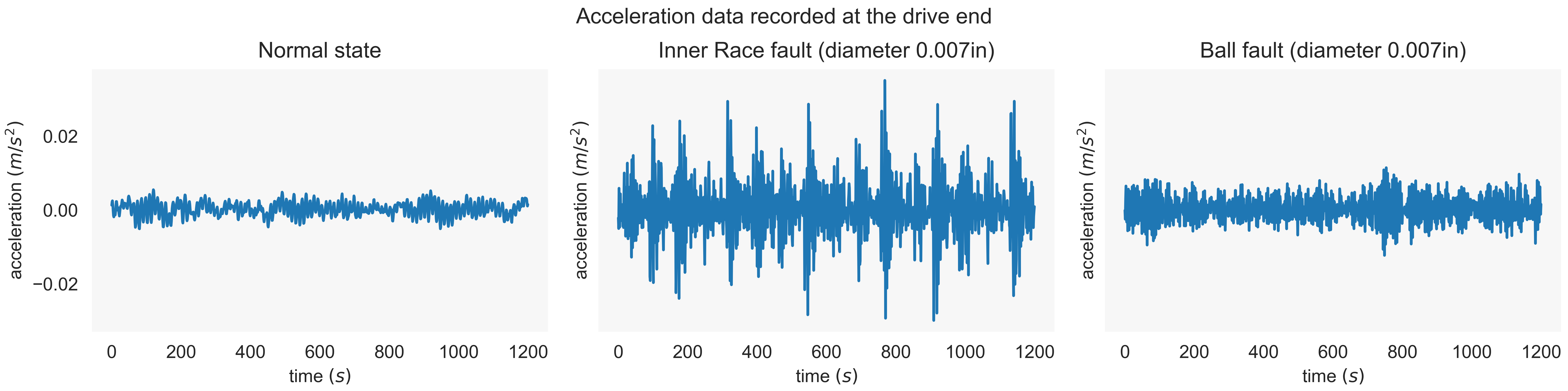 The dataset collects acceleration recorded for normal (N) operations, failure of the steel balls (B), in the inner ring (I) or the outer ring (O) (we will not consider the latter damage).