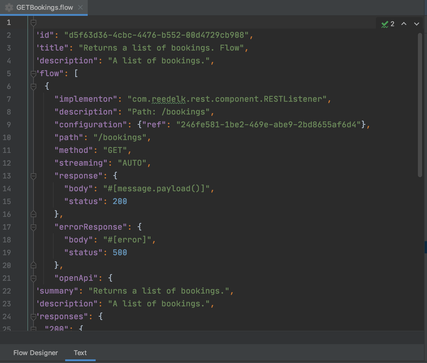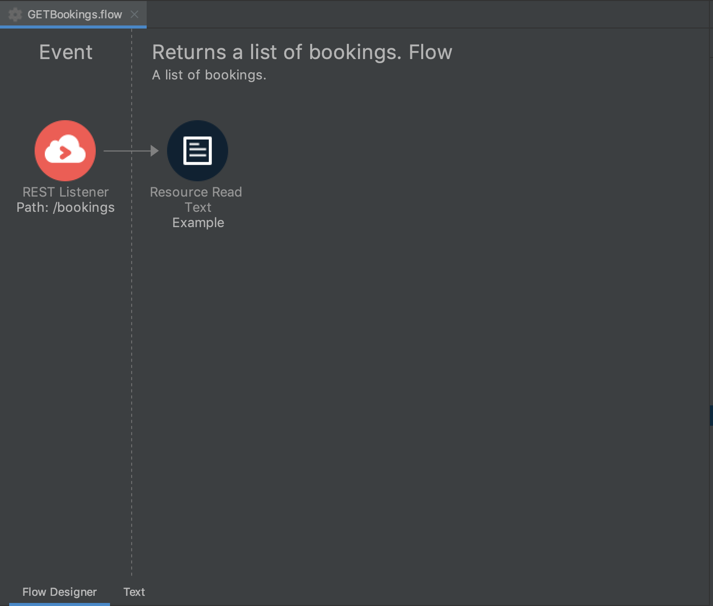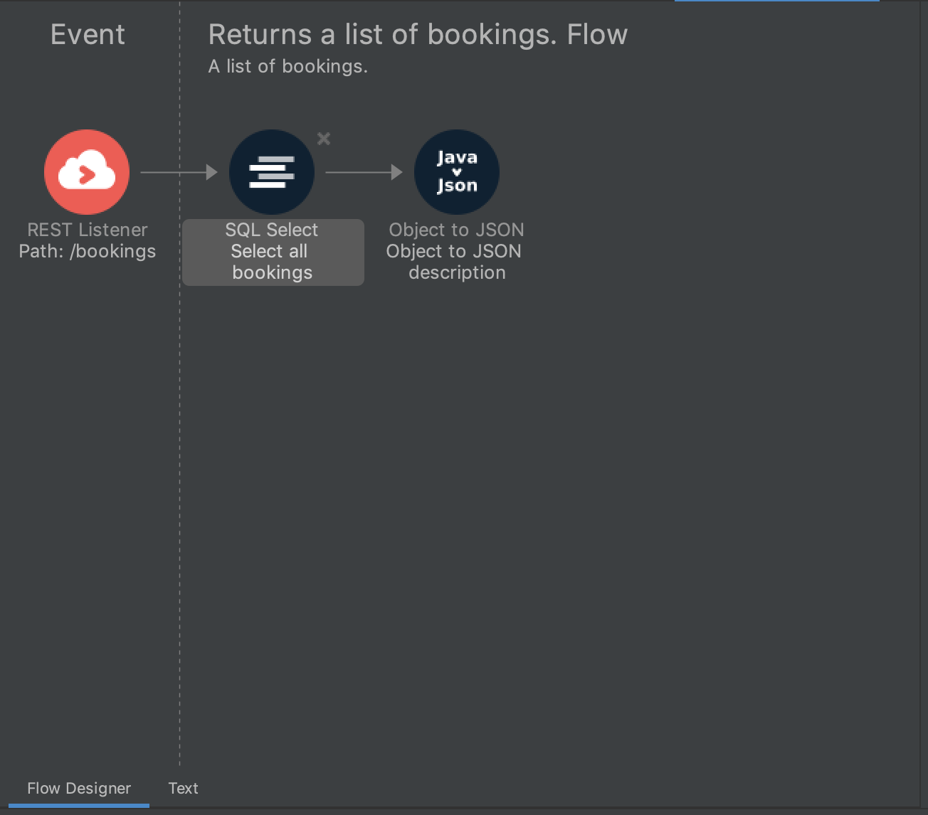 The first flow for querying all bookings through an API is now complete. This is a simple flow that does not contain any business logic. It transforms the data into the JSON format.